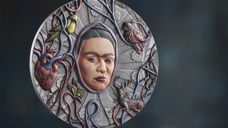 FRIDA 2 Oz Silver Coin pays homage to Frida Kahlo, an icon of art, resilience, and individuality. She reshaped the world of art with her unique blend of surrealism and Mexican folk, challenging traditional norms and inspiring countless artists. The coin has an Antique Finish quality, High Relief, and a digital printing. It comes in a case, along with a Certificate of Authenticity. Limited mintage of only 500 pieces worldwide.