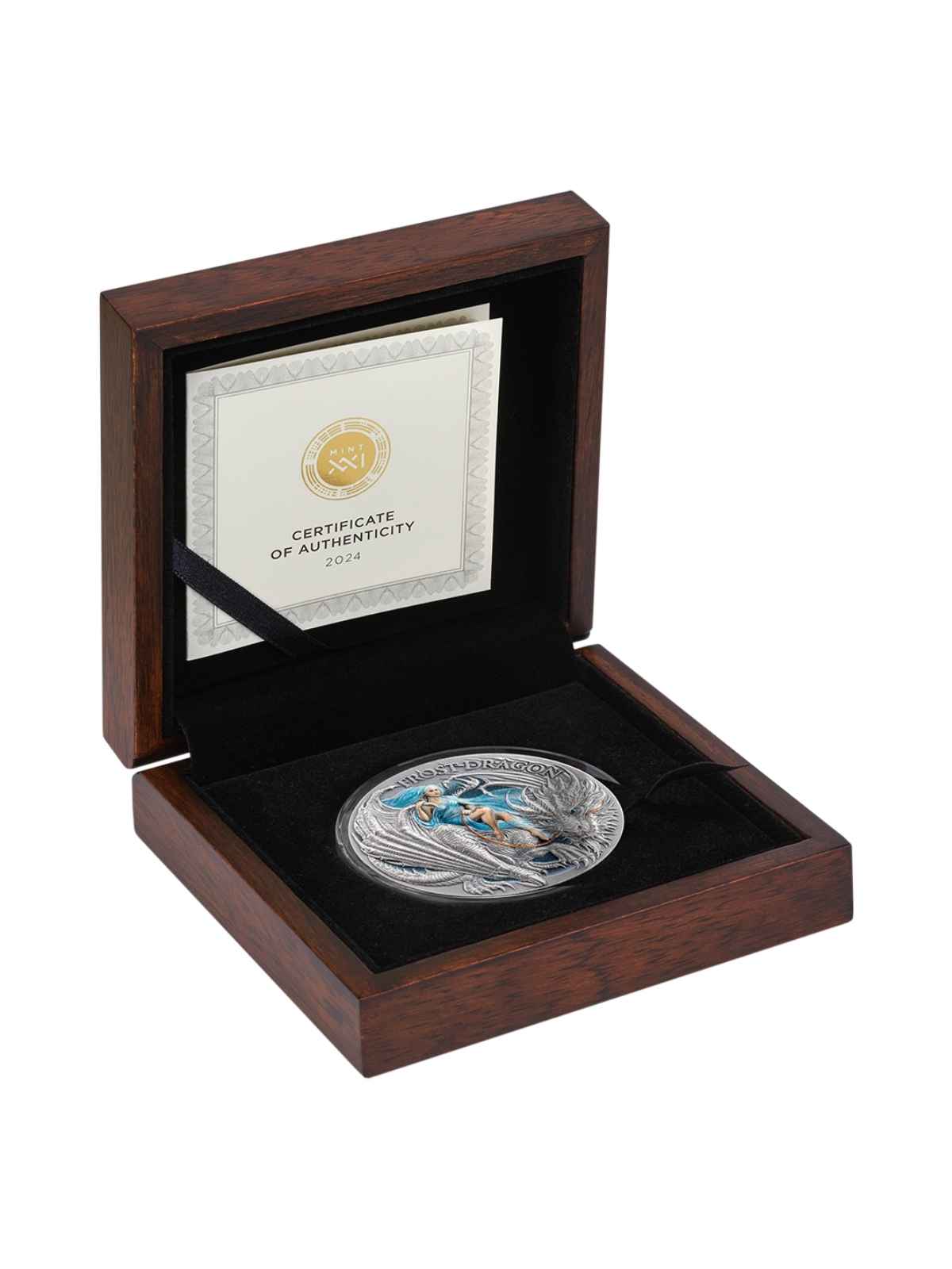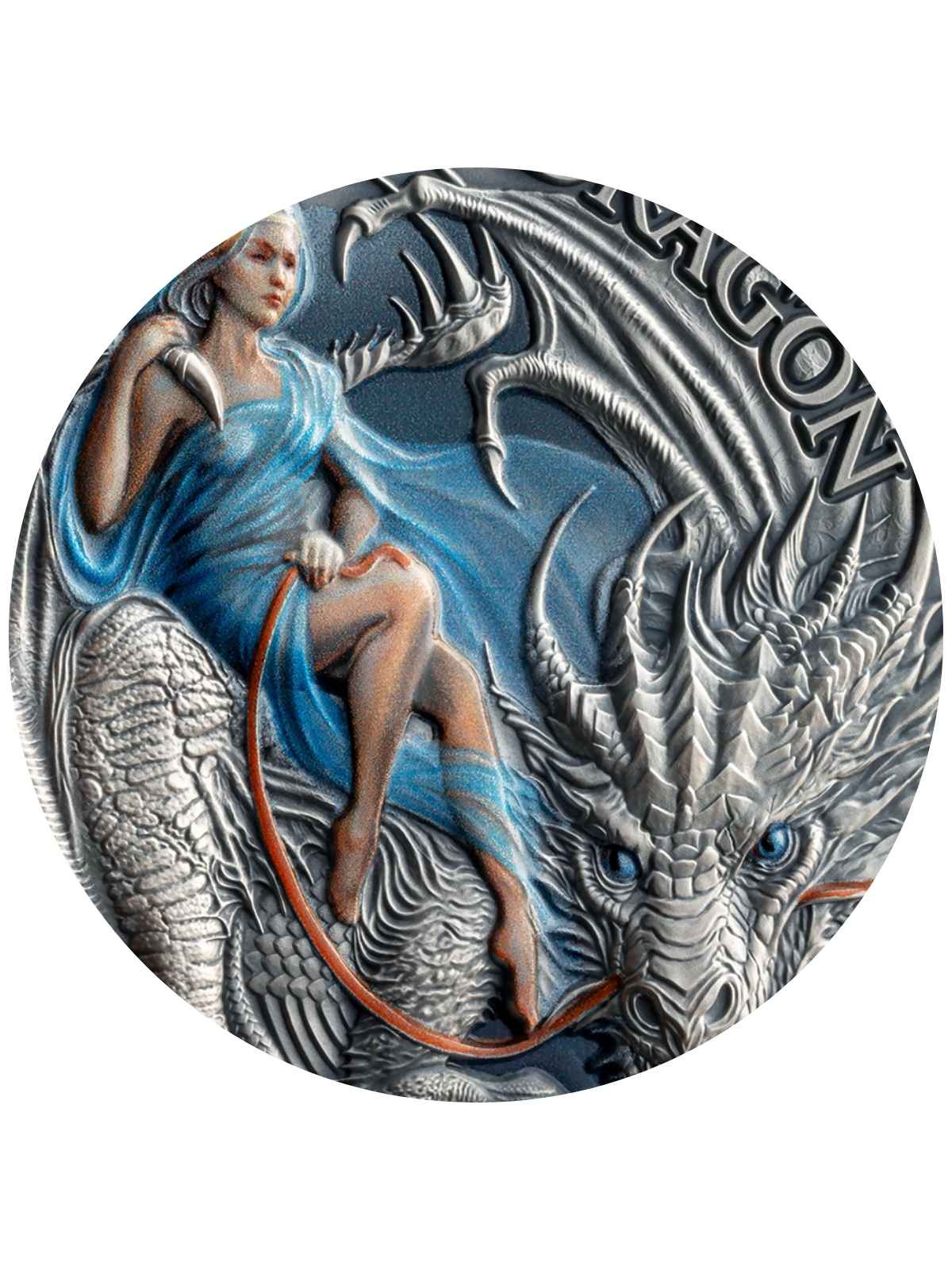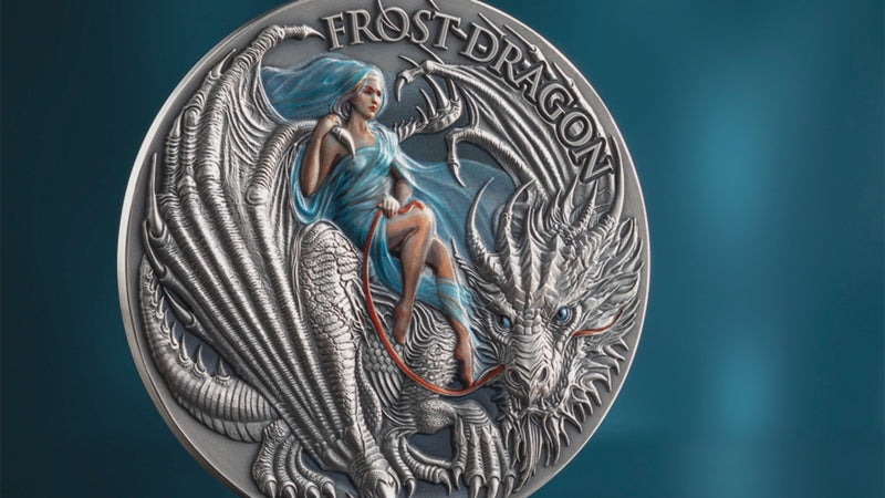 This charming 2 Oz Silver coin is part of the series "Dragonology" and is dedicated to the frost dragon, dwelling in the heart of cold mountains, breathing out frost, sculpting the air into icy artworks. This coin has Antique Finish quality, High Relief and digital printing. It comes in a case, along with a Certificate of Authenticity. Limited mintage of 500 pieces worldwide.