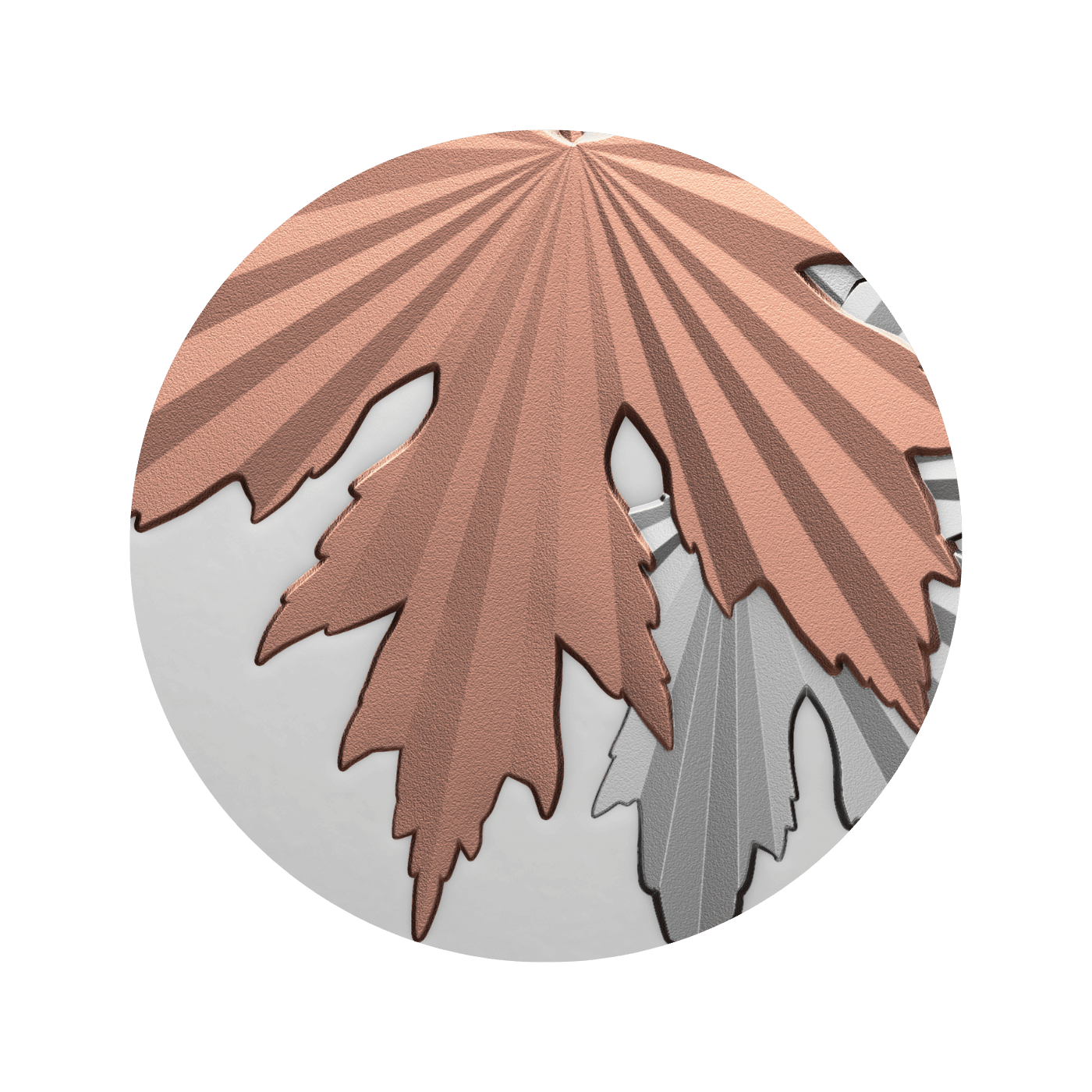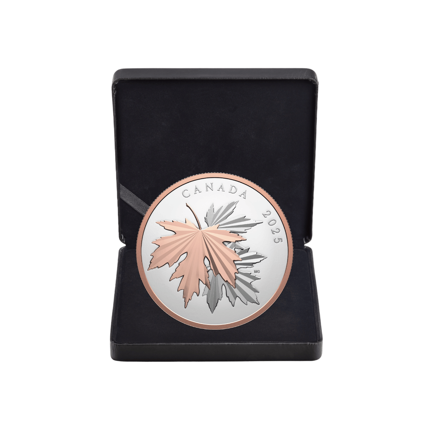 These characters make it easy to identify a silver maple tree, and they are artfully explored on this 10 oz. 99.99% pure silver coin, which uses multifaceted engraving to create a striking effect. Radiating outward from the petiole, the angled lines form peaks and valleys that reflect light in an extraordinary way within each leaf—especially the top one, which is highlighted with rose gold plating that gives it a beautiful blushing hue.