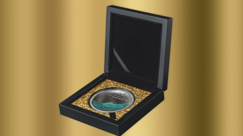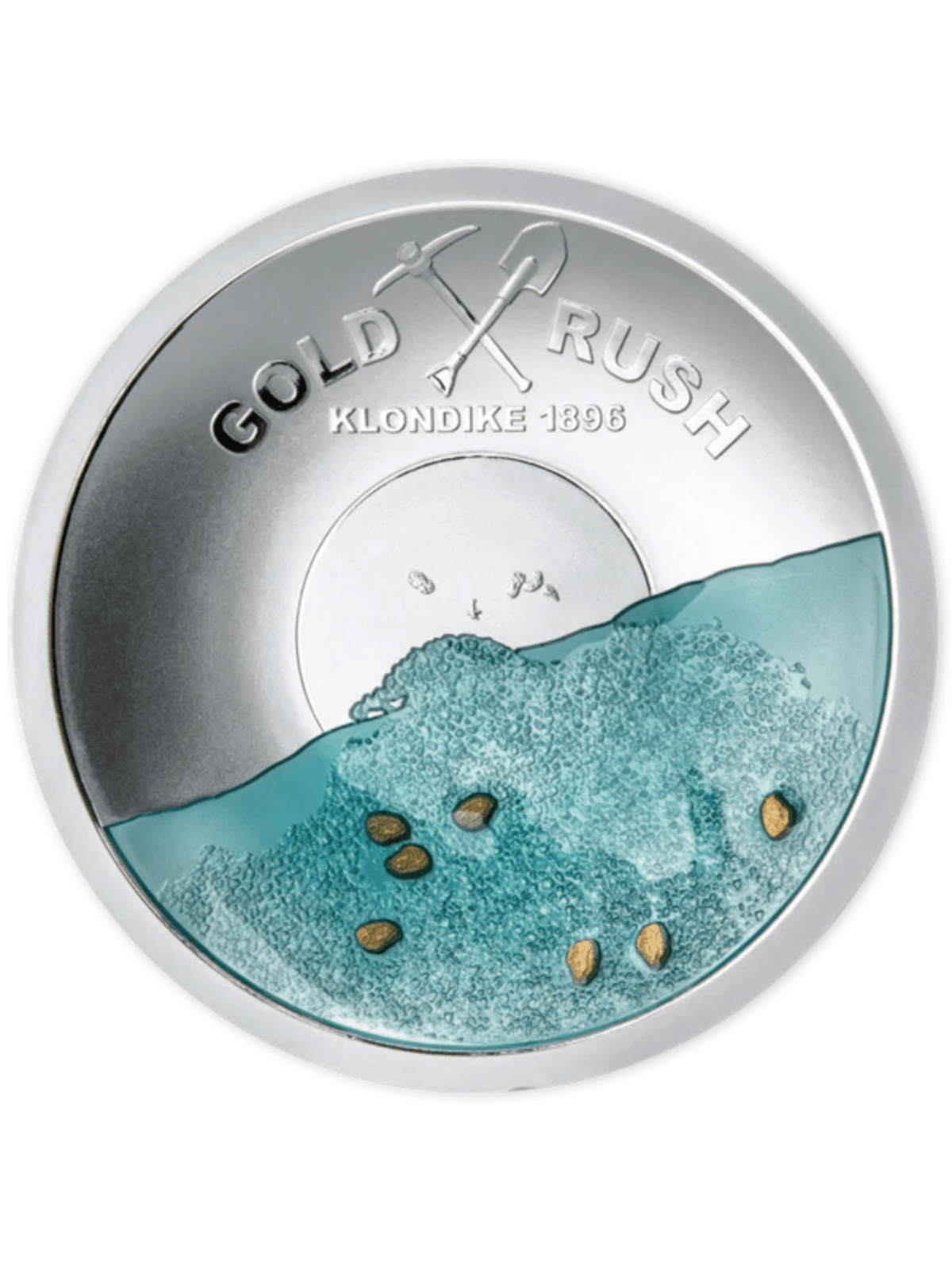 GOLD RUSH KLONDIKE Silver coin commemorates the 125th Anniversary of the discovered of the Gold in the Klondike, triggering a stampede of prospectors. The coin has a Convex shape, a beautiful translucent blue Enamel and a Gold plated nuggets inlays. It comes in a case, along with its Certificate of Authenticity. Limited mintage to 1999 pieces worldwide!