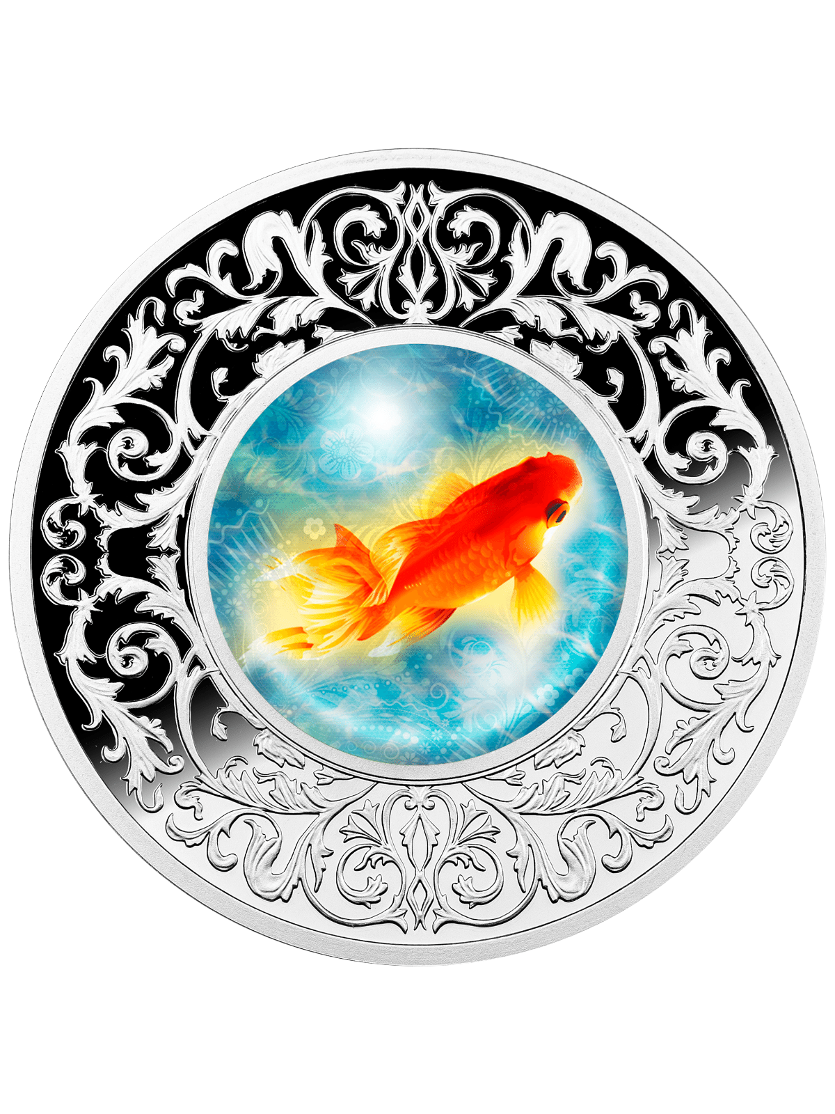 GOLDFISH Lucky Charm Silver coin is dedicated to the Goldfish, symbol of a positive energy which is enclosed under the lens and favours the smile of fate. The coin features a beautiful design, has a Proof quality, is decorated with microprinting and has a magnifying lens. It comes in an elegant display case, along with the Certificate of Authenticity. Limited mintage to 999 pieces worldwide!