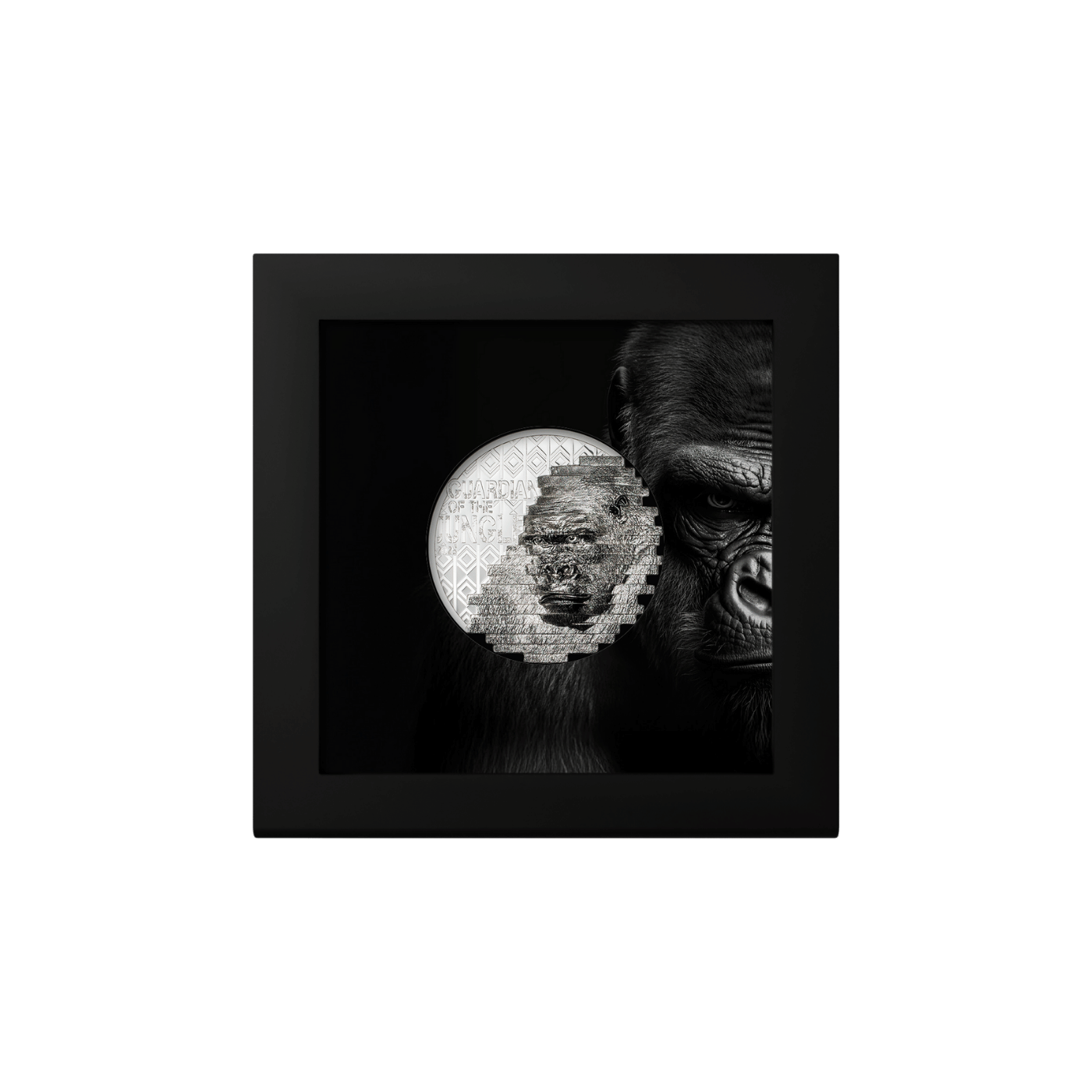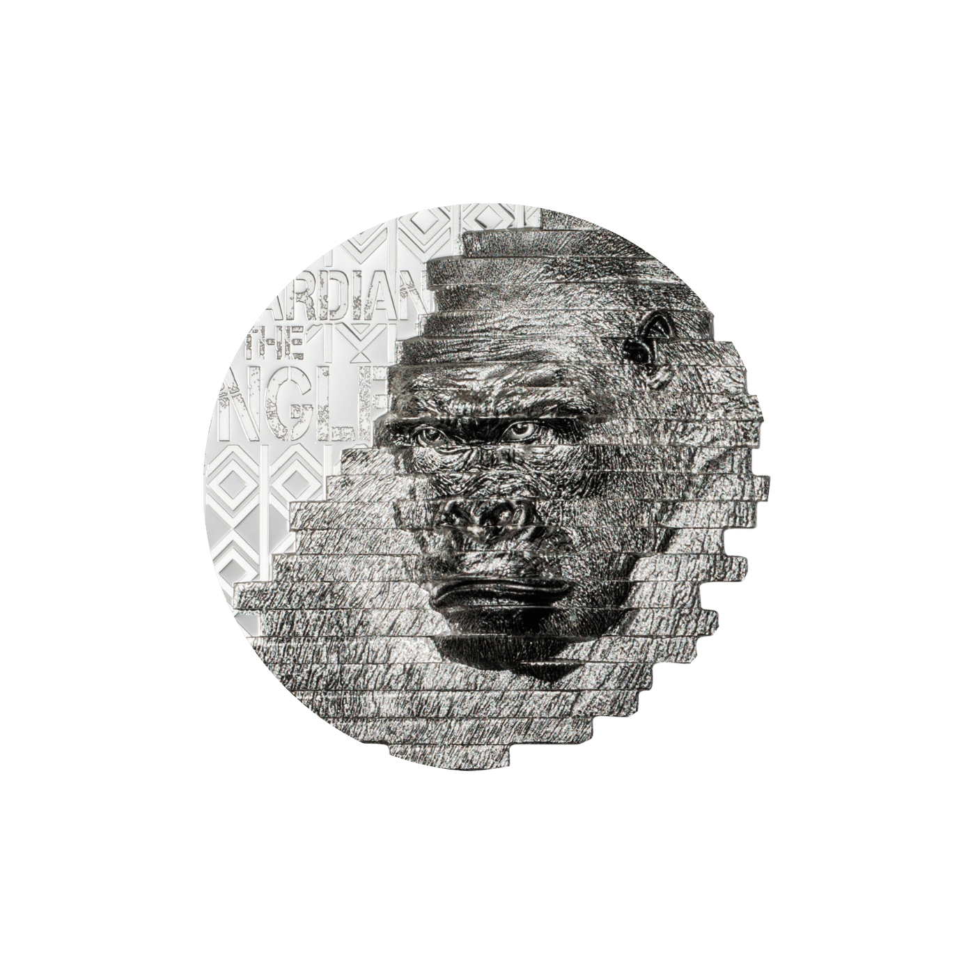 The gorilla's image is crafted through intricate silver segments, giving the impression that its form rises from the coin’s surface and extends beyond its boundaries. This technique creates a dramatic, almost sculptural visual effect that is both futuristic and deeply symbolic.