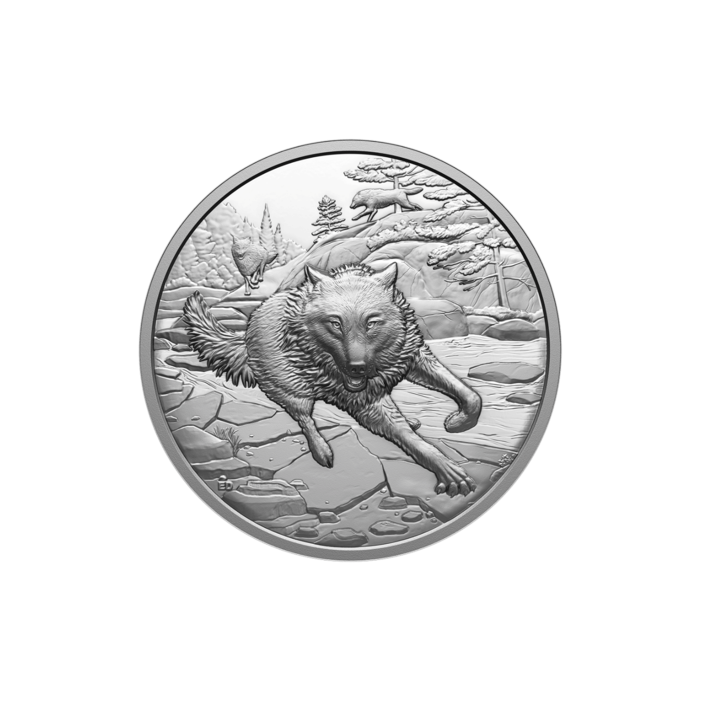 The reverse design immerses you in the chase—seen from the prey’s perspective—as a determined pack closes in, each member playing its role. Struck with multi-level Ultra High Relief (UHR) and a proof finish, the result is a lifelike and dynamic snapshot of Canada’s wild predator in motion.