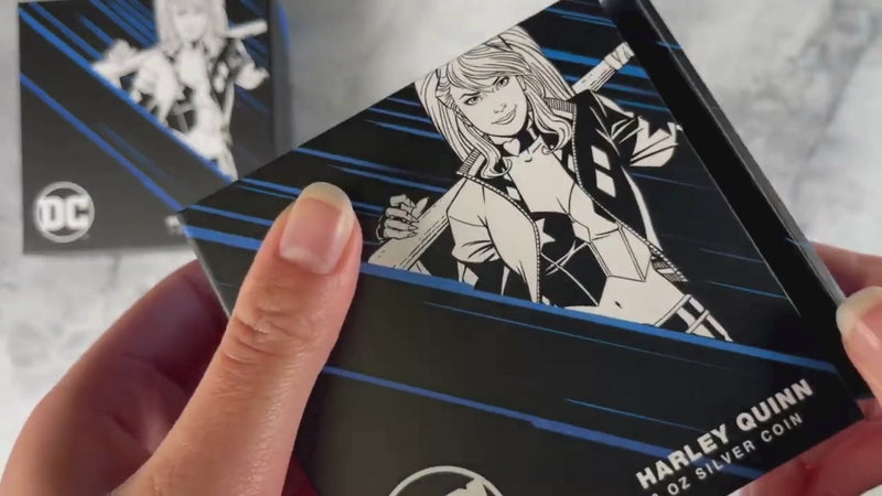 Introducing the limited edition HARLEY QUINN™ 3oz pure silver coin, inspired by the iconic DC villain from DC Comics.