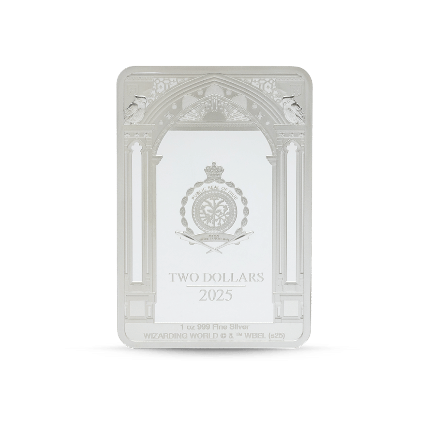 An intricately engraved arch is featured on both sides of the coin. Inspired by the iconic Hogwarts architecture, it's complete with gothic tracery and two owls perched on either side.