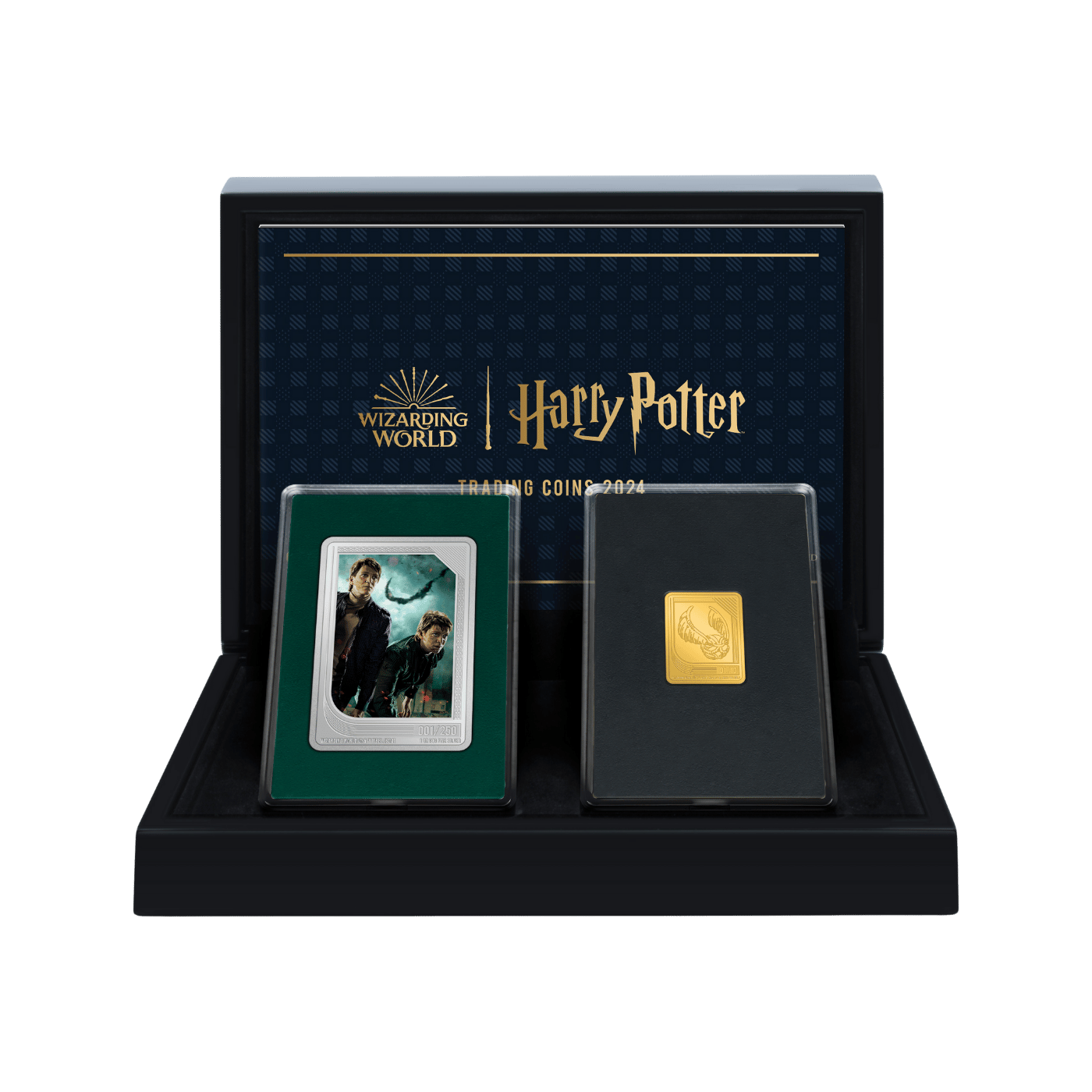 Channel your inner seeker with our HARRY POTTER™ Trading Coins. Six distinctive sets with a total of 51-coin designs, each with an individual mintage. Break open your box to reveal two secret coins inside. Will you secure your favorite witch or wizard in pure silver? Or catch the ultimate prize... one of just 10 Golden Snitch™ 1/4oz pure gold coins?
