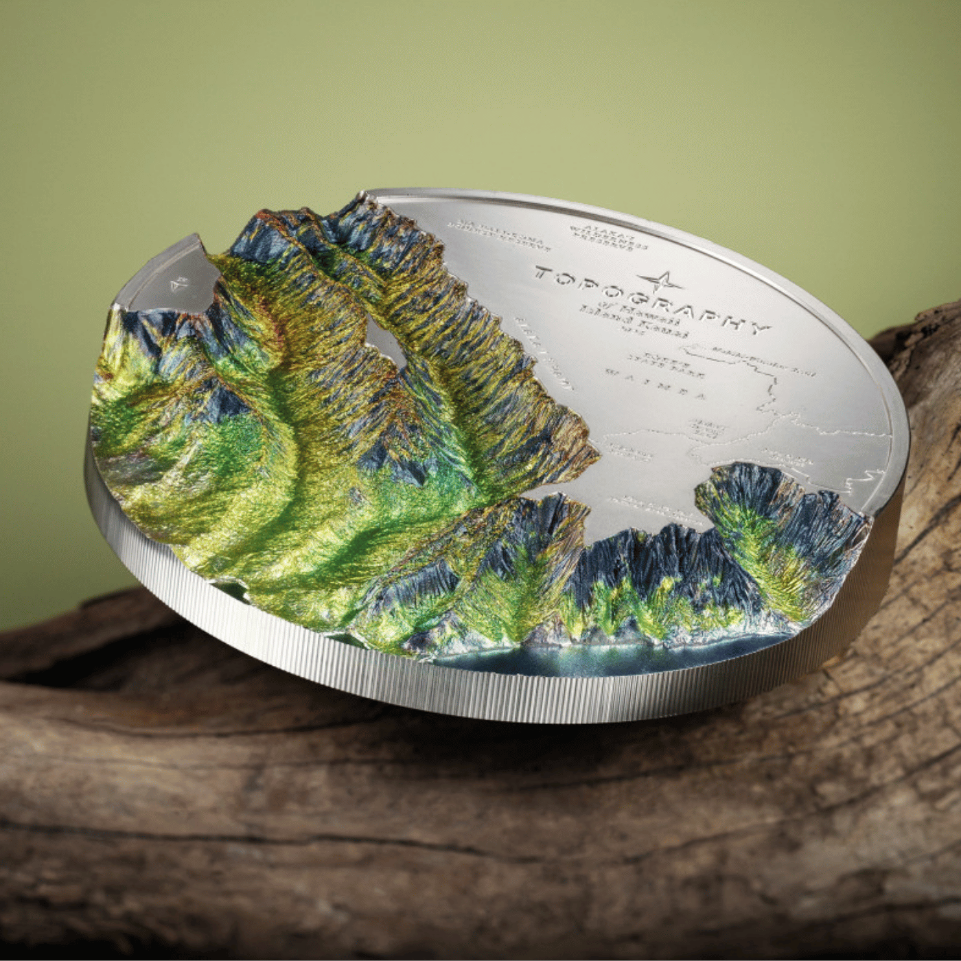 Aloha and welcome to Kauai, the garden island of Hawaii! The volcanic island is not only famous for its lush vegetation and impressive variety of plants, but also for its spectacular red rocks and cliffs, formed by millions of years of erosion and volcanic activity. Pictured is an original section of one of the oldest Hawaiian Islands. As with its predecessor, the Grand Canyon, the ultra-deep relief is created thanks to smartmintingĀ® technique. But it is the realistic coloring that makes this coin a numismatic wonder of nature. This 1-kilogram edition is limited to only 77 pieces.