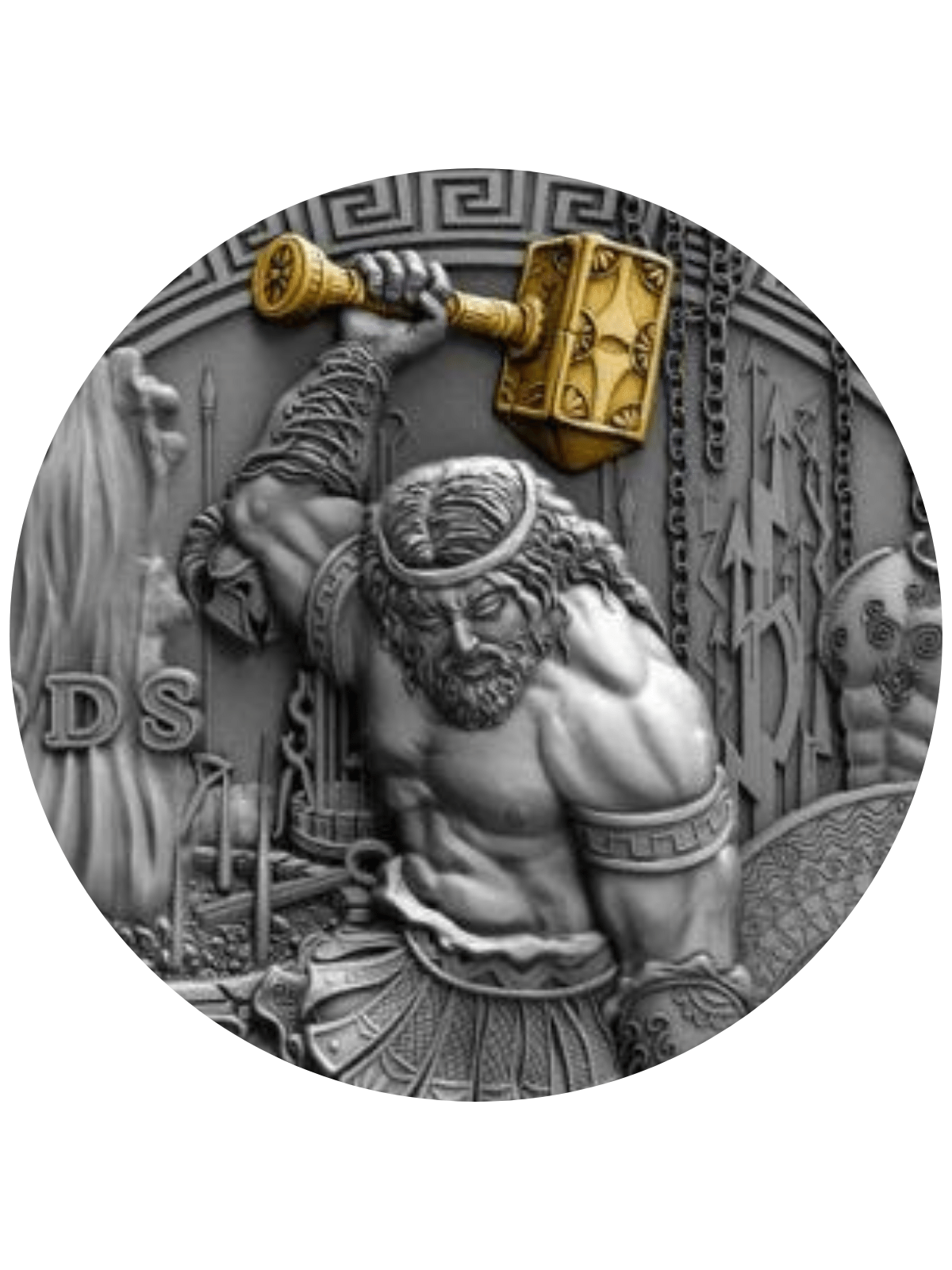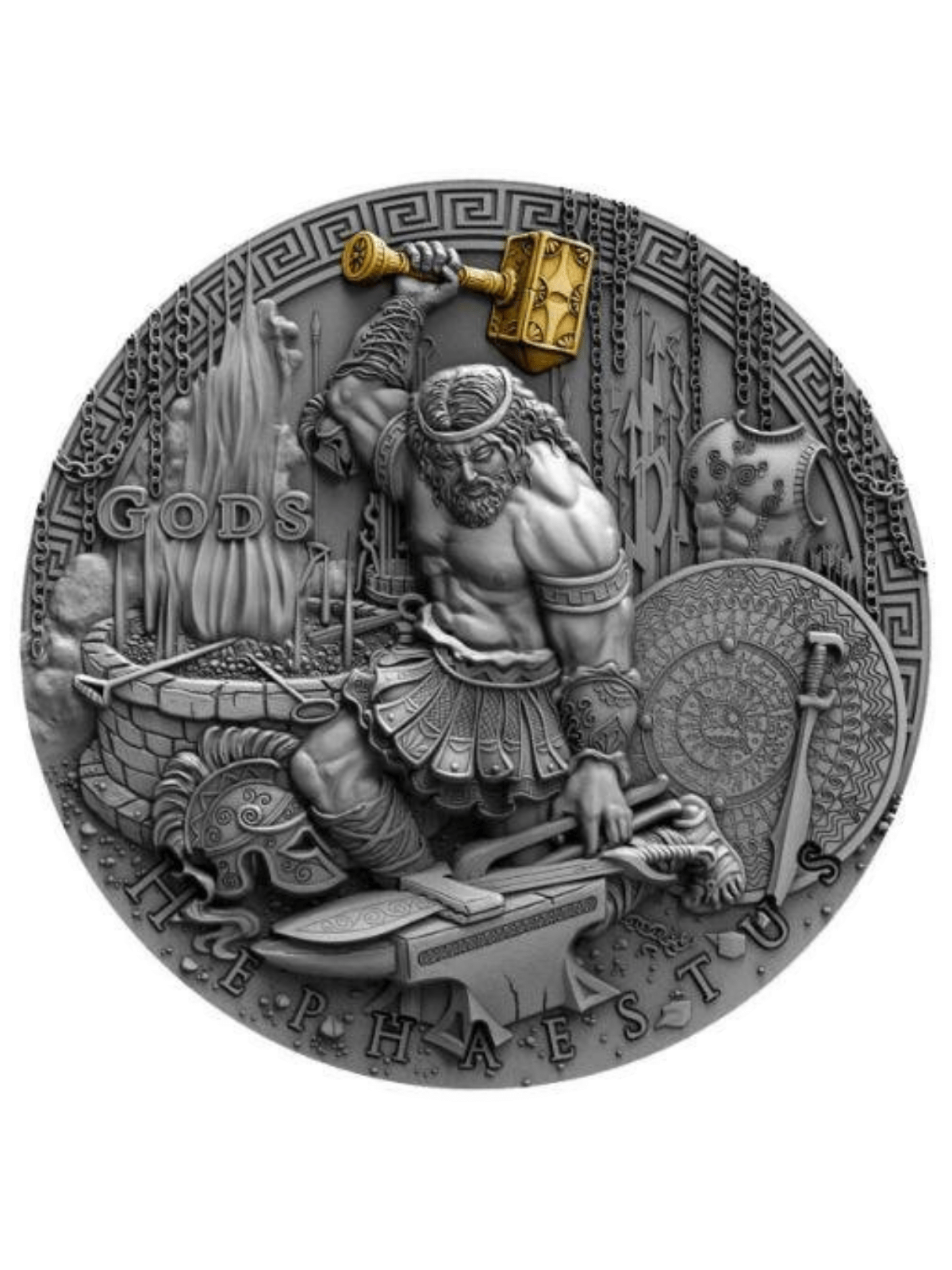 The third release in the awe-inspiring "Gods" series. Paying homage to the legendary Hephaestus, this coin showcases meticulous attention to detail and remarkable artistry