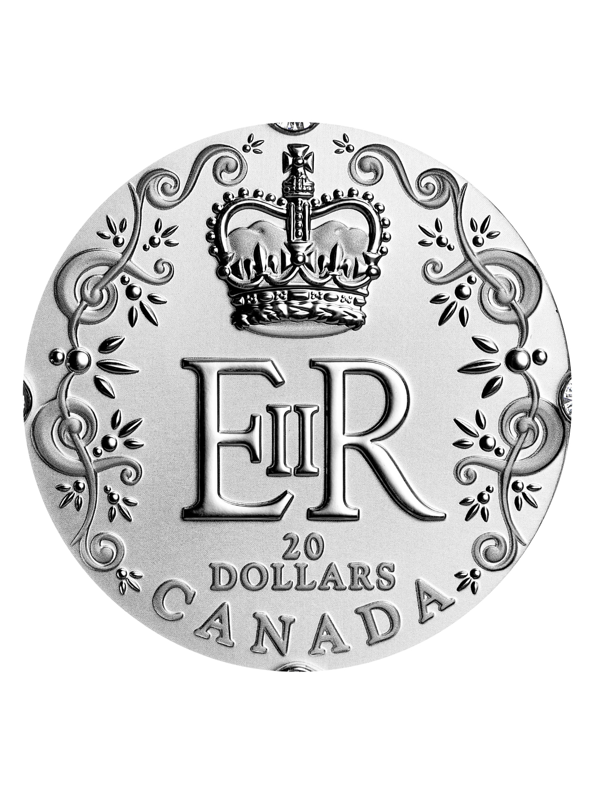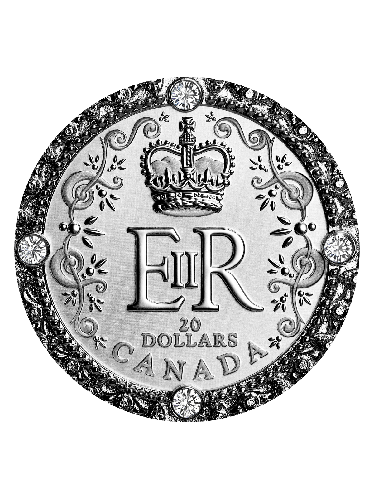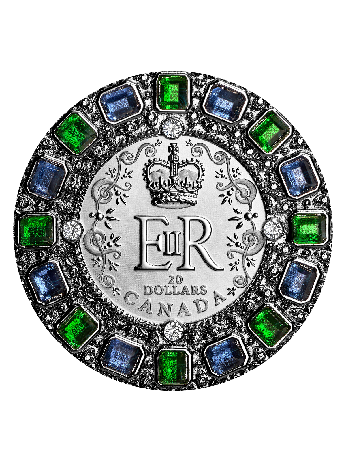 Symbolic Stones and Crystals: The reverse design is adorned with 16 blue and green glass stones, representing the historic jewels that adorn the Imperial State Crown and those from Queen Elizabeth II's personal jewelry collection. Additionally, four crystals are featured, one for each of the effigies that have graced Canadian circulation coins since 1953.