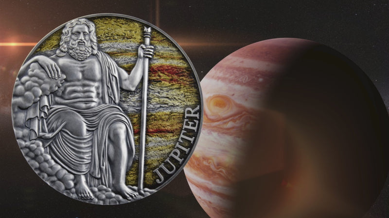 JUPITER Planets and Gods wonderful 3 Oz Silver coin is the new issue from the “Planets and Gods” series. In this edition – Jupiter. The coin features a wonderful digital coloration, has a nice Relief, has a great design, has an Antique Finish quality and comes in a case, along with its Certificate of Authenticity. Limited mintage of only 500 pieces worldwide!