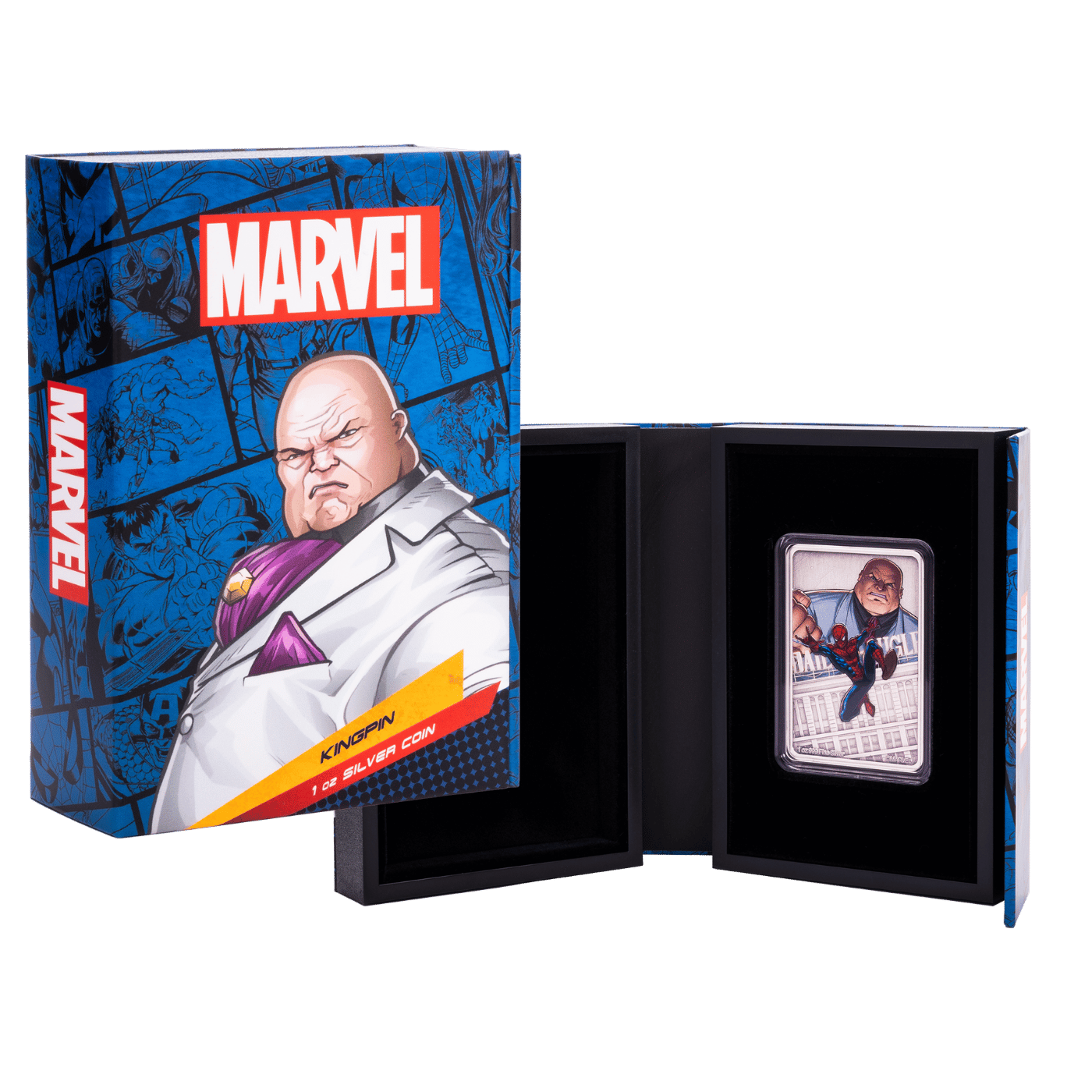 - Fit For a King: The Marvel-branded packaging displays an image of Kingpin on the front. Open it up to find the coin nestled in black velvet.