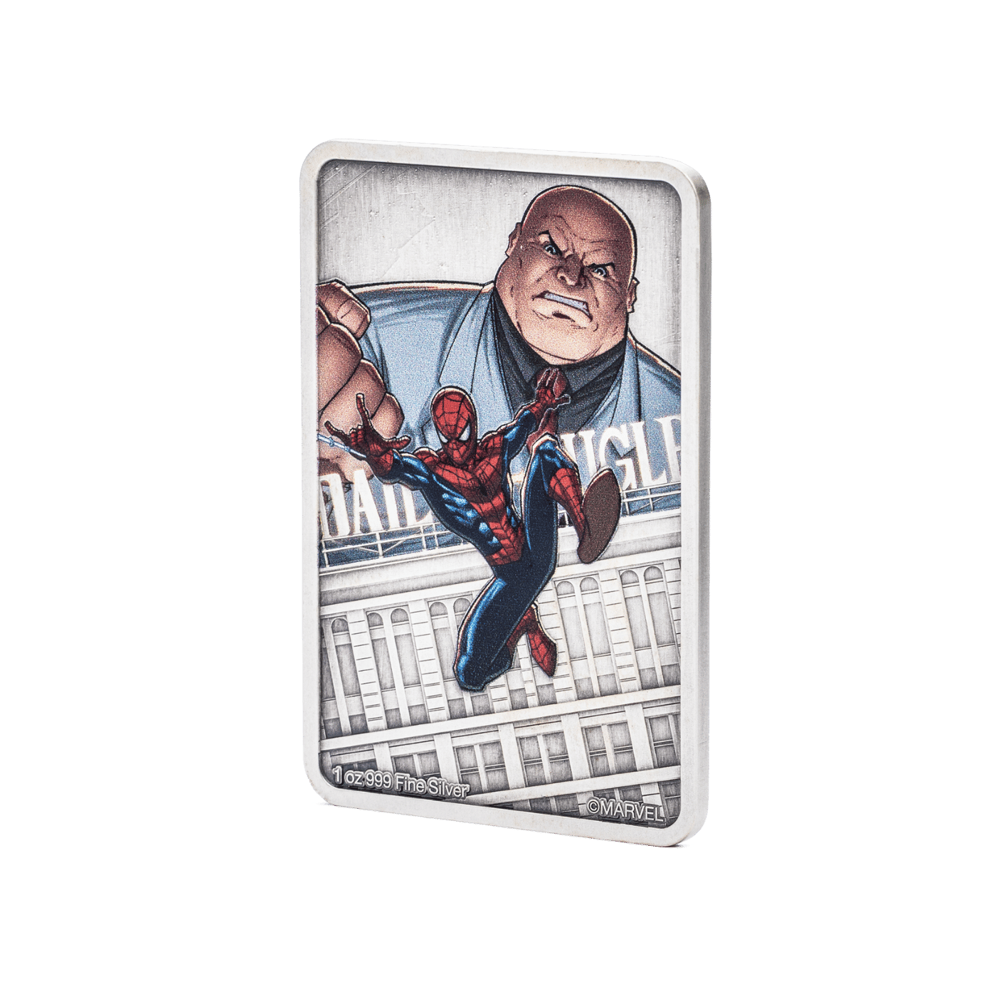 - Rivals in Color: The coin highlights a colored graphic of the Web-Slinger and powerful crime boss preparing his iron fist.