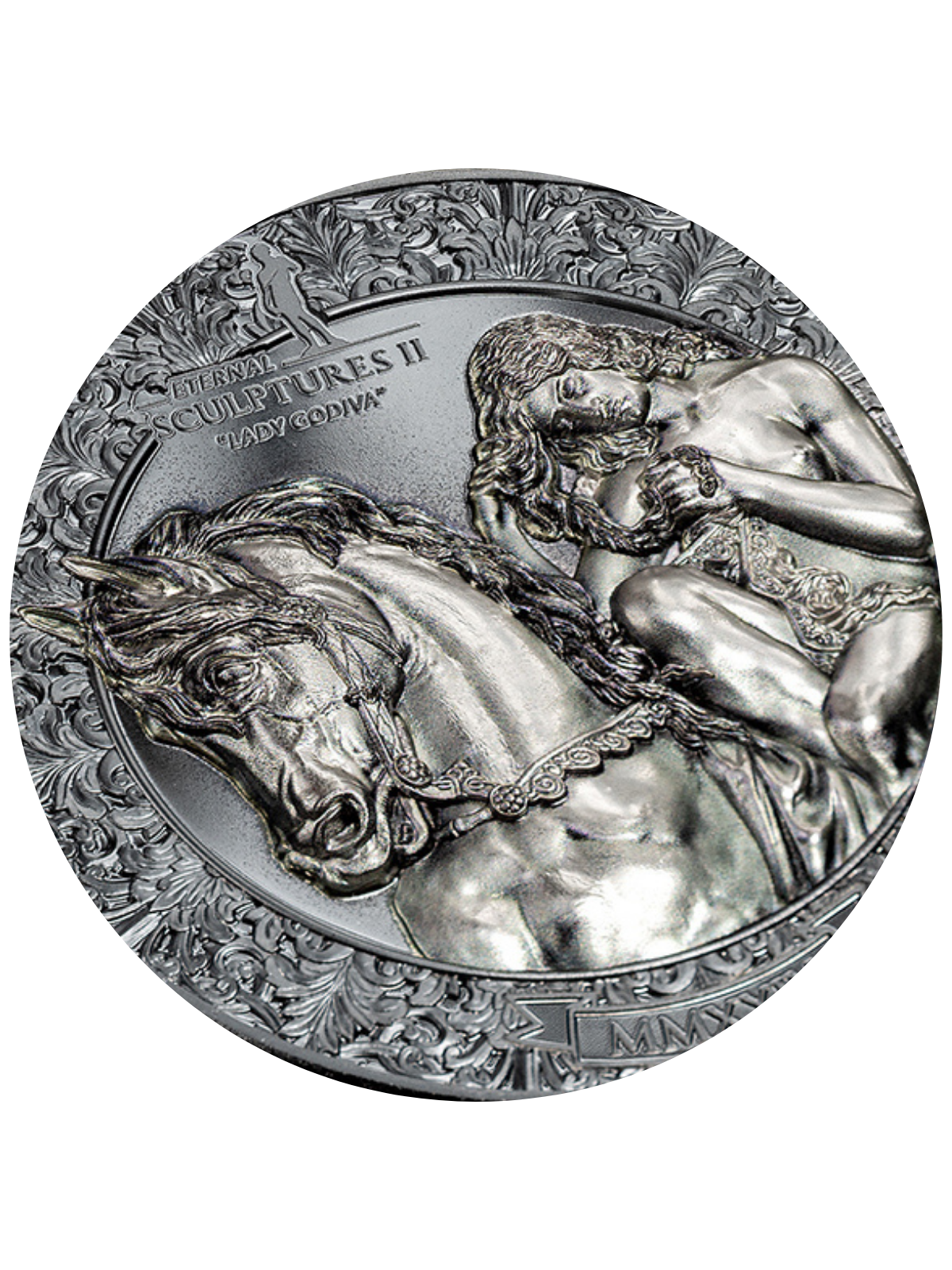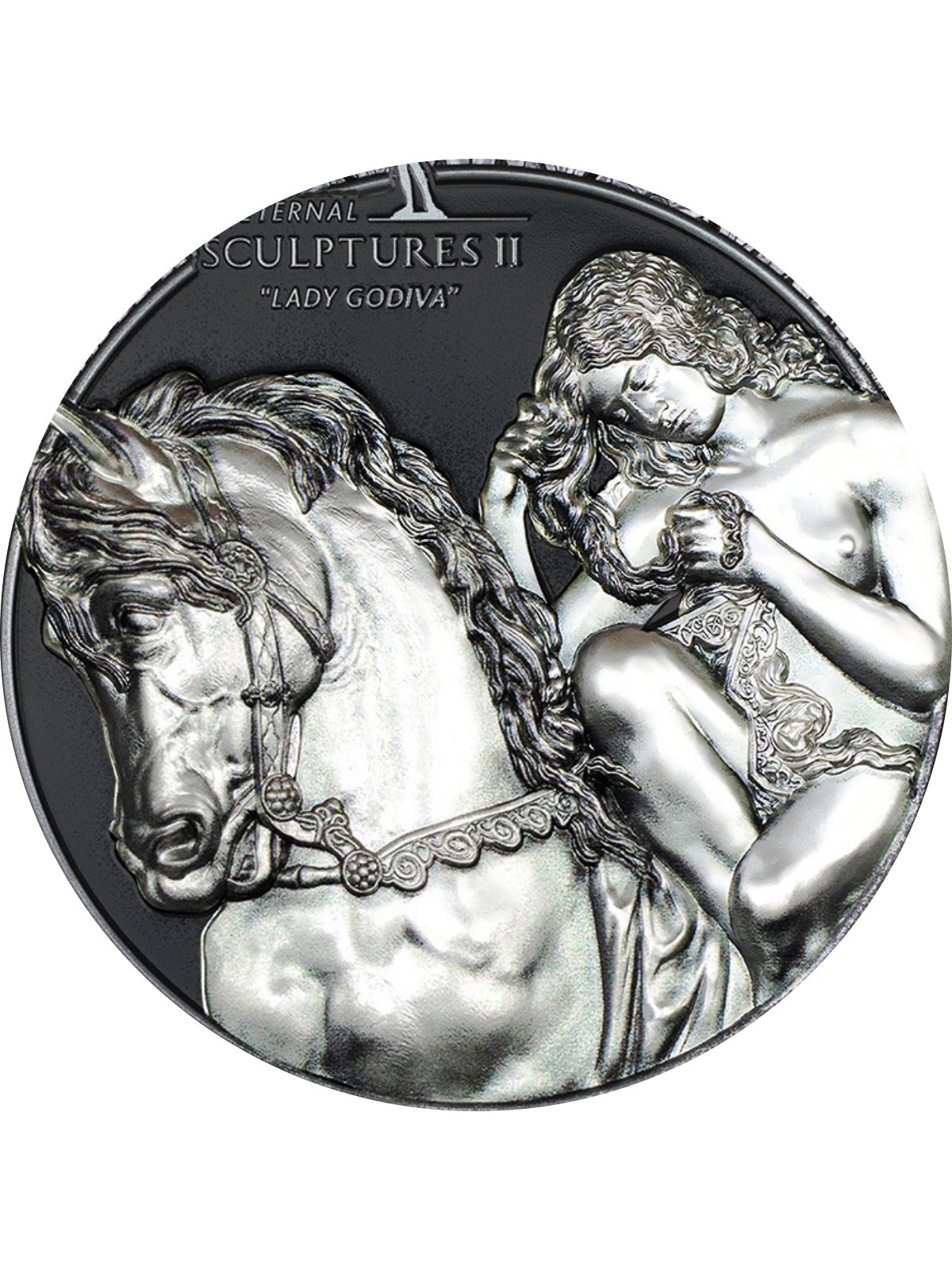 LADY GODIVA 3 Oz Silver coin is the third release in the "Eternal Sculptures II" series, dedicated to the most famous and beautiful sculptures. In this issue: Lady Godiva, the 11th-century Anglo-Saxon noblewoman who was known for her legendary naked ride through the streets of Coventry in England. The coin features Smartminting Ultra High Relief on both sides, has Black Proof quality and comes in a case, along with the Certificate of Authenticity. Limited mintage of 499 pieces worldwide!