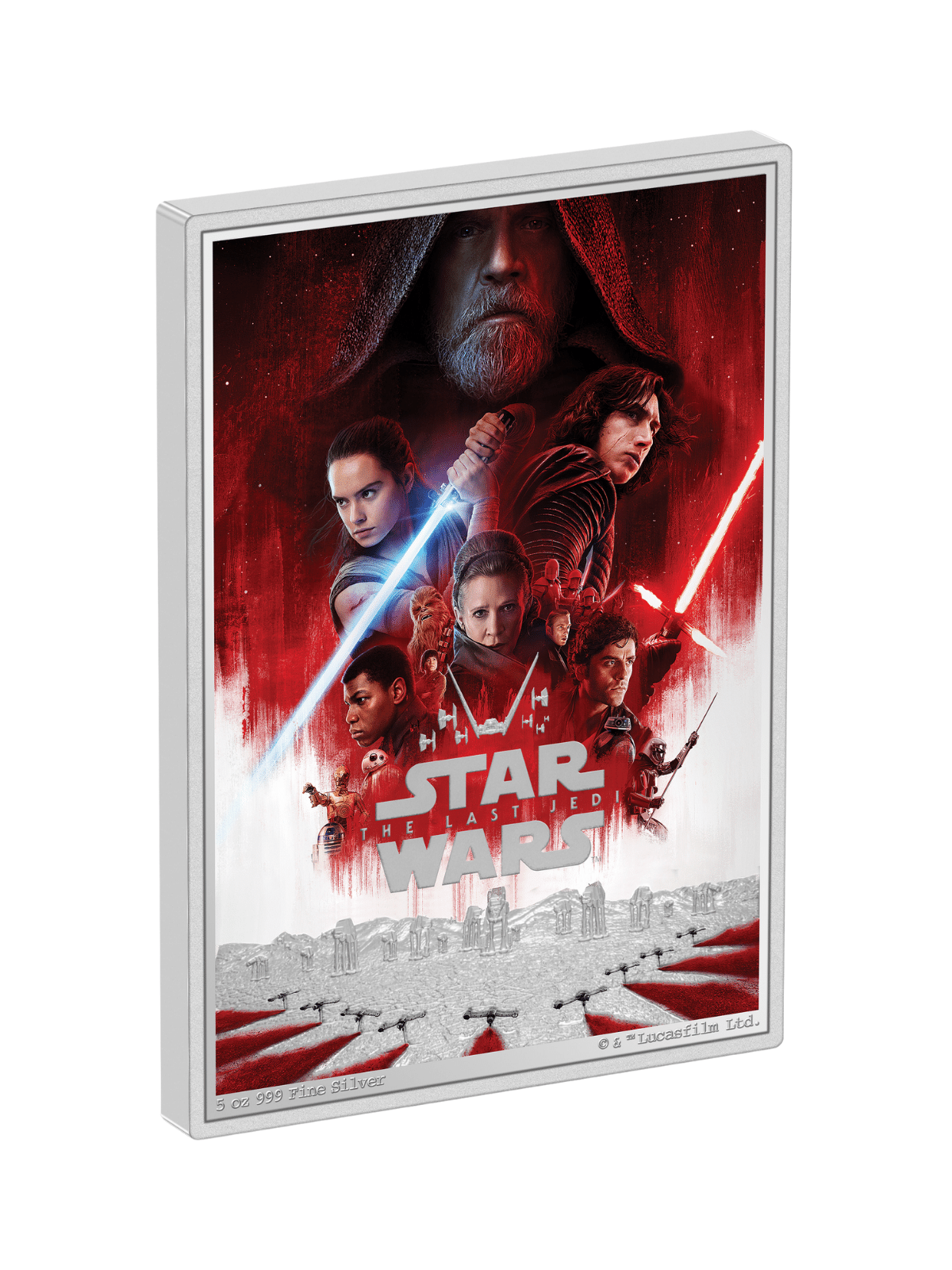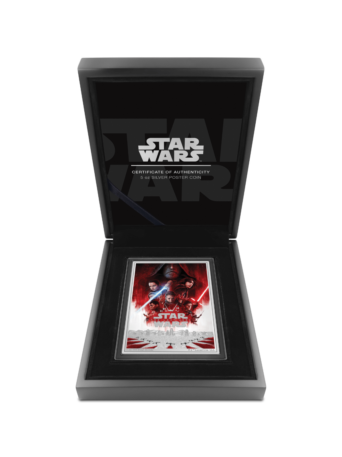 LAST JEDI POSTER 5 Oz Silver Coin features an incredible depiction of the theatrical release poster for Star Wars XIII: The Last Jedi. The coin has a rectangular shape, vibrant coloration, and a Proof quality finish. It comes in a themed case, along with a Certificate of Authenticity. Limited mintage of only 200 pieces worldwide!