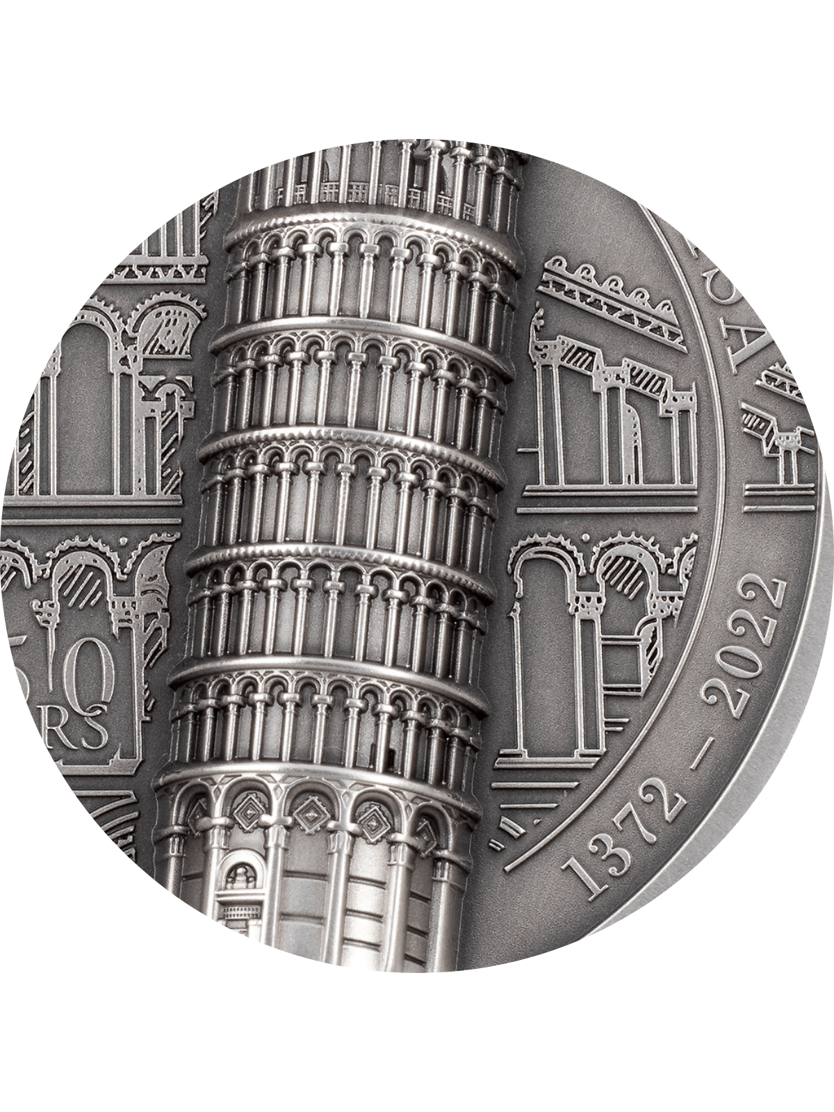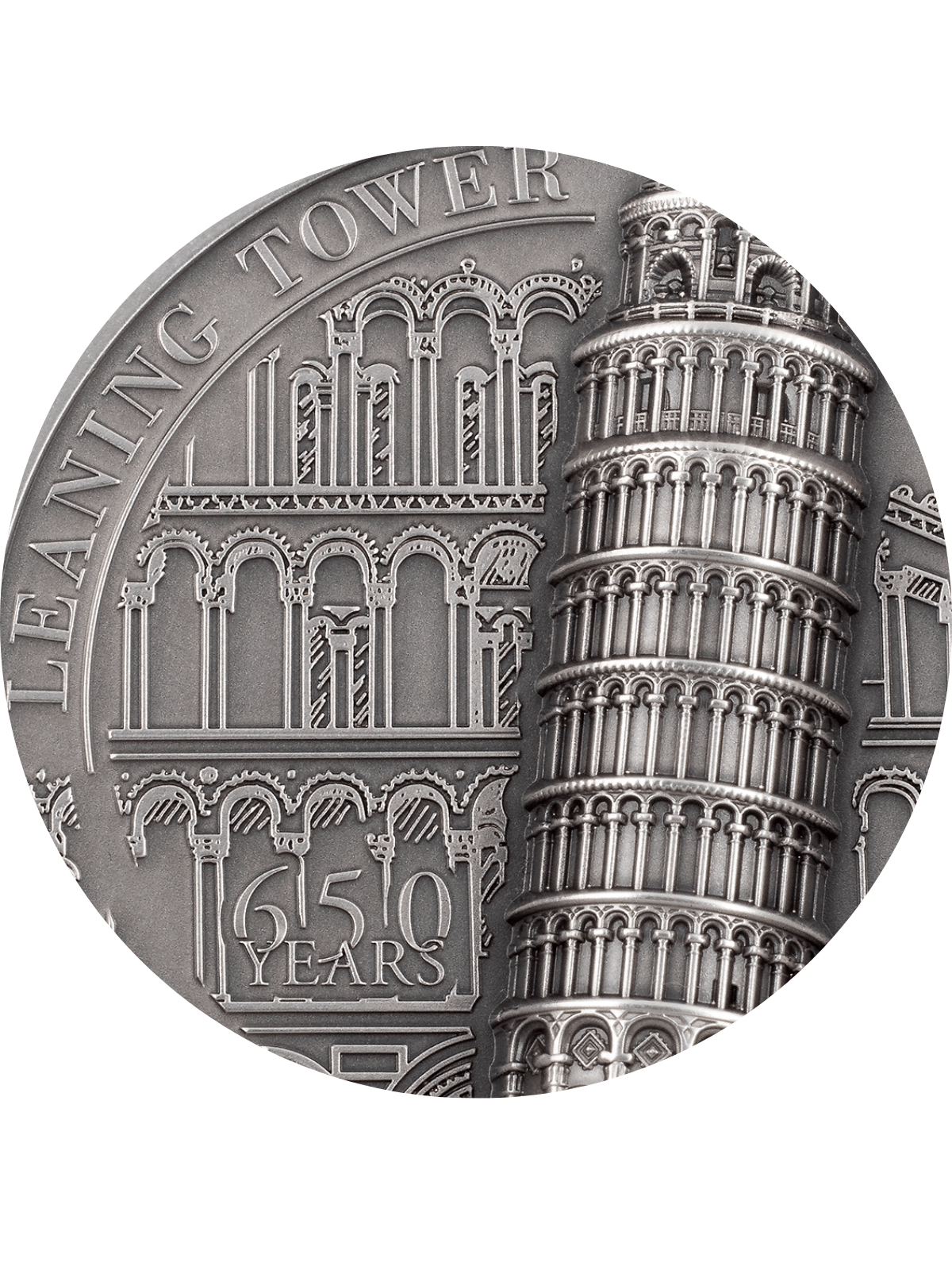 LEANING TOWER OF PISA 2 Oz Silver coin celebrates the 650th Anniversary of one of the most photographed landmarks in the world: the Leaning Tower of Pisa. The coin has a flat bottom edge, has Ultra High Relief thanks to Smartminting Technology and has Antique Finish. It comes in a case, along with the Certificate of Authenticity. Limited mintage to 1372 pieces worldwide!