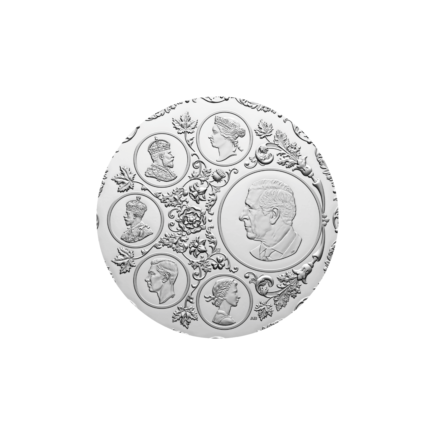 The coin’s reverse is framed by elegant acanthus leaves and the botanical emblems of both the United Kingdom (Tudor rose, thistle, shamrock, and daffodil) and Canada (maple leaf), reinforcing its symbolic bridge between nations and centuries.