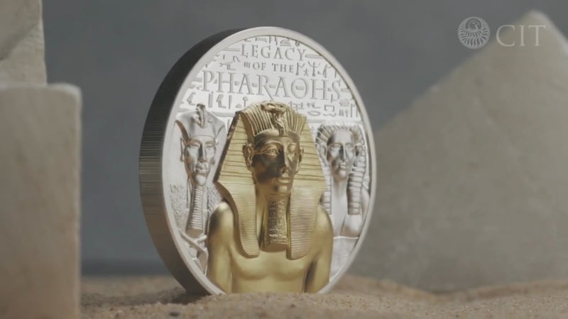 LEGACY OF THE PHARAOHS 3 Oz Silver coin shows the grandeur and splendor of the Pharaohs and the architectural wonders that were built to honor them. The coin features Smartminting technology, has selective Gilding, has Proof quality and comes in a beautiful case, along with the Certificate of Authenticity. Limited mintage to only 888 pieces worldwide!