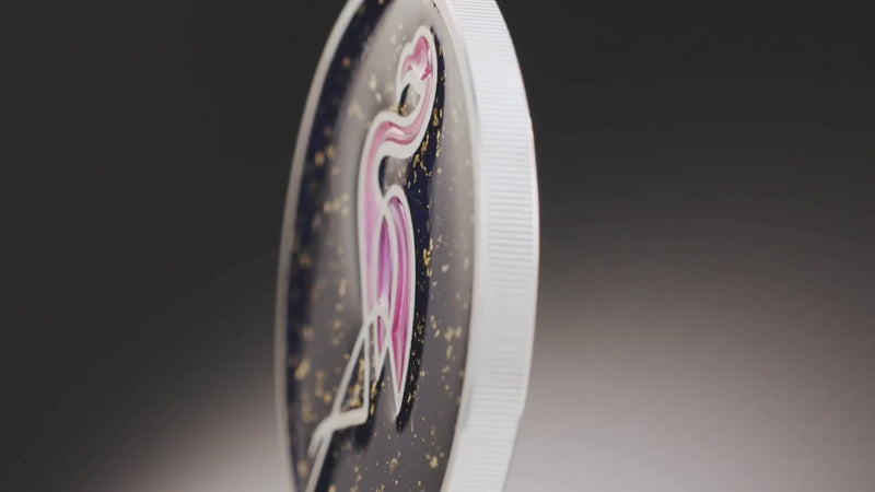 At the center of the design is a highly stylized flamingo, rendered in a clean pink silhouette that radiates grace, balance, and modern flair. To heighten the coin’s sense of refinement, the flamingo is fully coated in glossy enamel, creating a smooth, luminous surface that enhances its sculptural elegance.