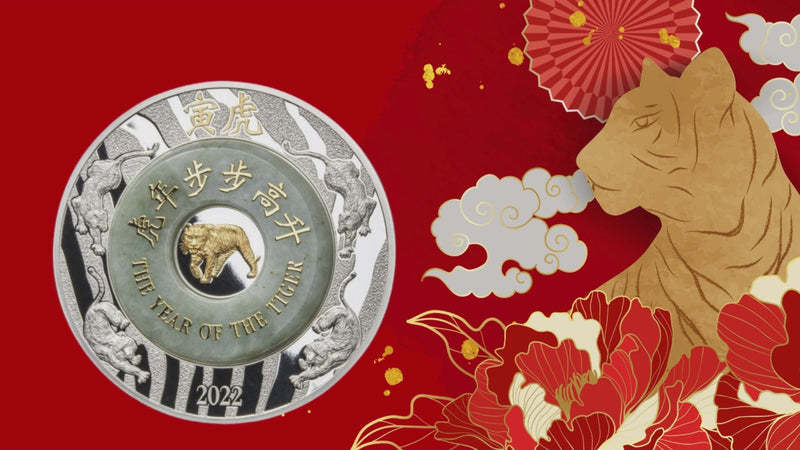 TIGER Jade Lunar Year 2 Oz Silver coin is dedicated to those born under the Chinese lunar year of the Tiger, they are courageous and active people. The coin has a real ring shaped Jade insert, has a selective Gold plating, has a Proof quality and comes in a presentation case, along with the Certificate of Authenticity. Limited mintage to 2888 pieces worldwide!