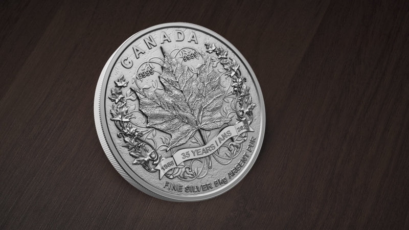 APLE LEAF 35th Anniversary 5 Kg Kilo Silver Coin is dedicated to the 35th Anniversary of the Silver Maple Leaf coin. The coin has Matte Proof quality, serrated edges, and comes in a luxury wooden case, along with a Certificate of Authenticity. Limited mintage of 150 pieces worldwide.
