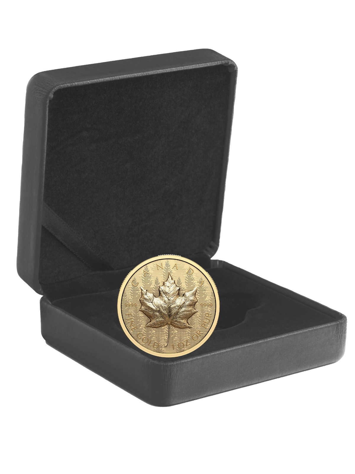 Launching in 2024, this ultra-high relief Gold Maple Leaf coin continues to captivate collectors. Crafted from 1 oz. of 99.99% pure gold, the coin features a dynamic pattern that mimics the depth and mystery of the forest, with trees struck in multiple depths that create a mesmerizing visual effect. This series is a collector's favorite, with only 550 coins available globally, each accompanied by a serialized certificate from the Royal Canadian Mint, ensuring its rarity and value.