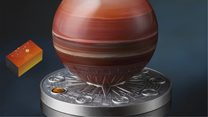 MARS Solar System 2 Oz Silver Coin is part of the impressive "Solar System" series. This series features each planet from our system. In this edition: Mars. The coin has an Antique Finish quality with High Relief and a Carnelian Sphere of 35mm. It comes in a beautiful themed premium case, along with its Certificate of Authenticity. Limited mintage of only 500 pieces worldwide.
