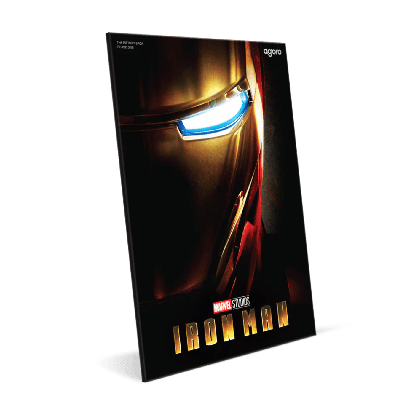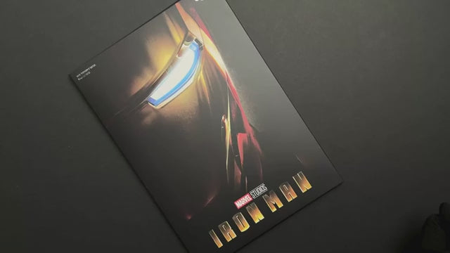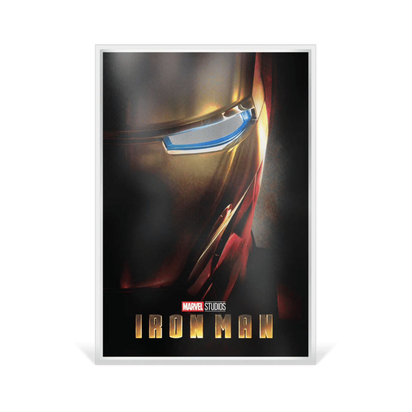 - The design features the Iron Man movie poster, highlighting a close-up of the hero in color with engraved detailing for the eye.