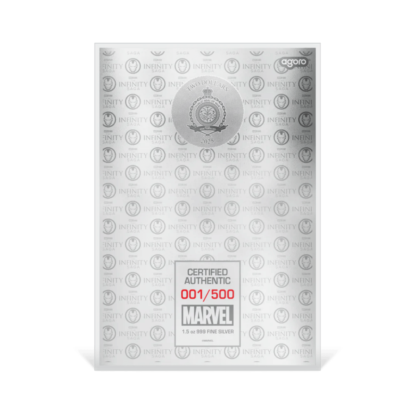 - The obverse is adorned with The Infinity Saga and Iron Man logos.