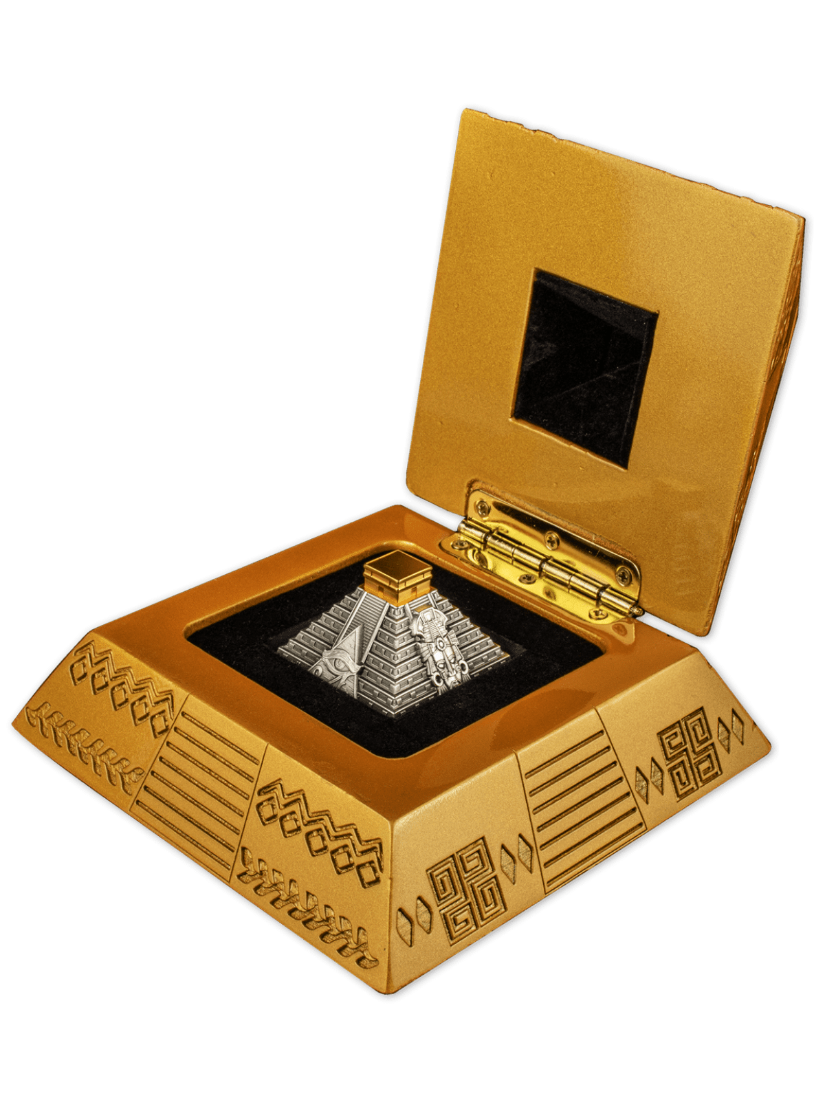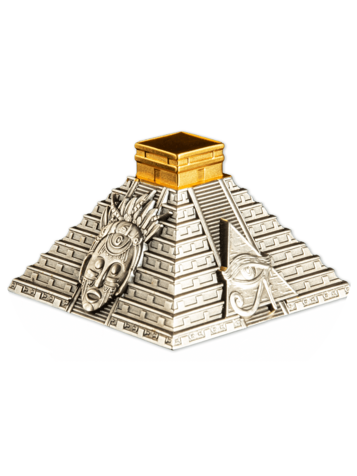 MAYAN PYRAMID OF CHICHEN ITZA 5 Oz Silver coin features the famous Mayan pyramid of Chichen Itza. The coin has an Antique Finish quality, a special Pyramid shape, a selective Gold Plating and a very detailed design. It comes in a special pyramid case, along with the Certificate of Authenticity. Limited mintage of 750 pieces