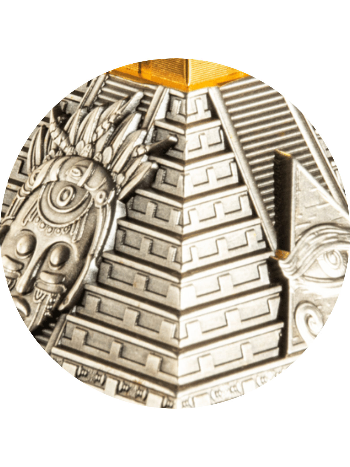 The 24K Gold plated top of the 5 oz Silver Pyramid coin depicts the characteristic look of the famous Temple of Kukulcán – one of the most spectacular UNESCO World Heritage Sites worldwide.