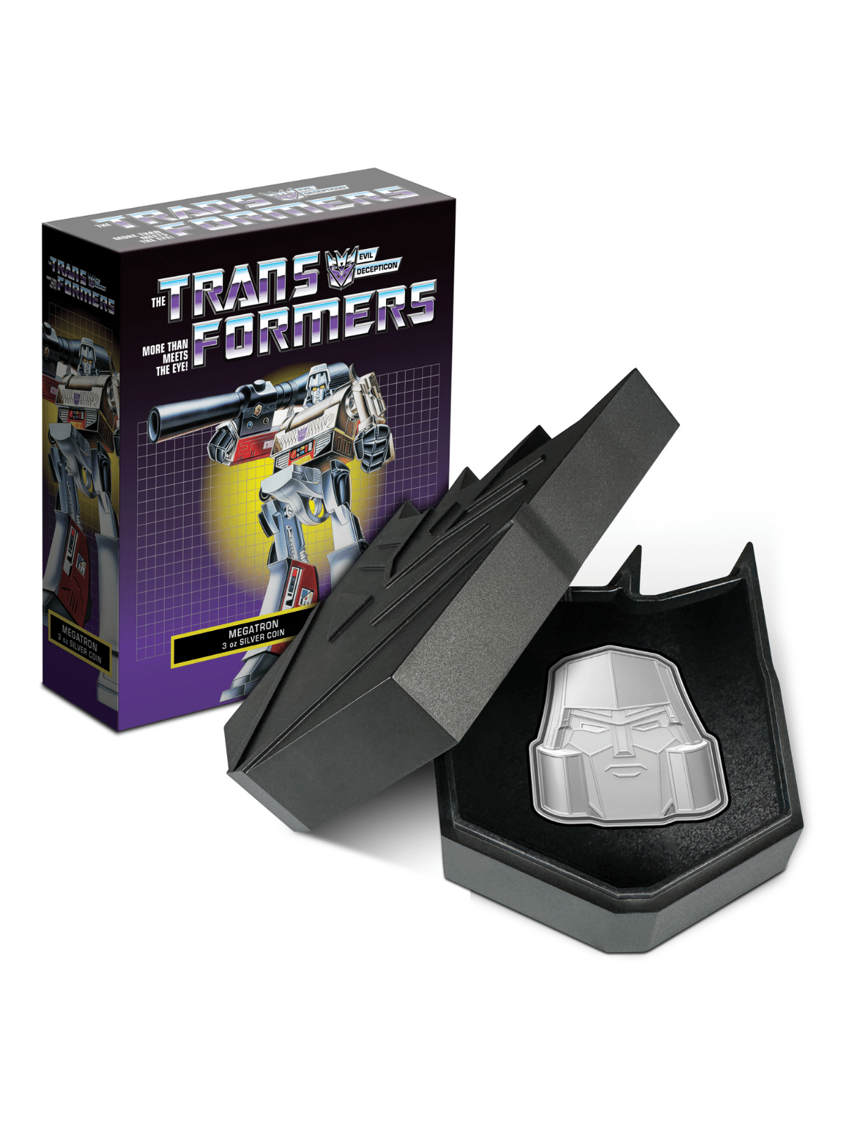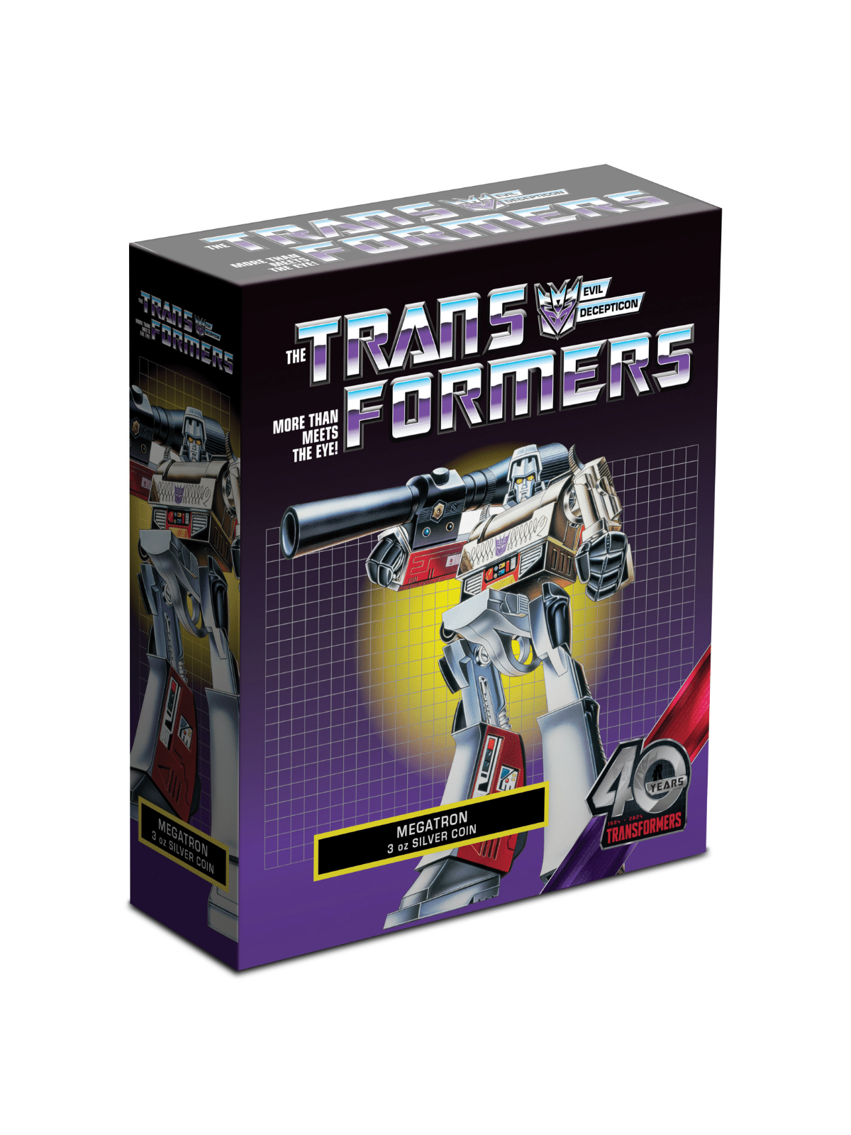 MEGATRON 40th Anniversary 3 Oz Silver Coin i 3 Oz Silver coin celebrates the 40th Anniversary of the iconic Transformers character Megatron, the main antagonist who transforms from a robot to a weapon and vice-versa. The coin comes in a themed case, along with the Certificate of Authenticity. Limited mintage of 1,984 pieces worldwide!