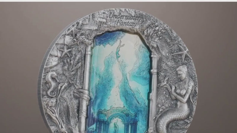 MERMAIDS Underwater Fantasy 3 Oz Silver coin is a tribute to the Mermaids, these sensual mythical figures, main characters of the series "Underwater Fantasy". The coin has an impressive Smartminting Ultra High Relief, has an Antique Finish quality and has a sophisticated use of enamel, giving an impressive depth and water effect. It comes in a case, along with the Certiticate of Authenticity. Limited mintage of 777 pieces!