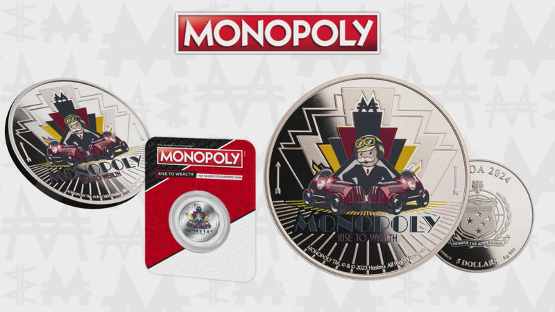 MONOPOLY Rise to Wealth 1 Oz Silver coin is dedicated to the best-selling board games in the world: Monopoly. The coin features Mr. Monopoly alongside two game piece cars in partial colour print. The coin is an officially licensed Hasbro product and comes in a single blister card. Mintage of 1,933 pieces worldwide to commemorate the first publication of Monopoly!
