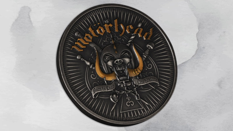 MOTORHEAD Band 1 Oz Silver coin is dedicated to the Motorhead band, combining influences from punk, hard rock, rock'n'roll, and blues rock. The coin has a beautiful shaped, Black Antique Finish quality & 24k Gold Plating and comes in a themed case, along with the Certificate of Authenticity. Limited mintage of only 1975 pieces worldwide!