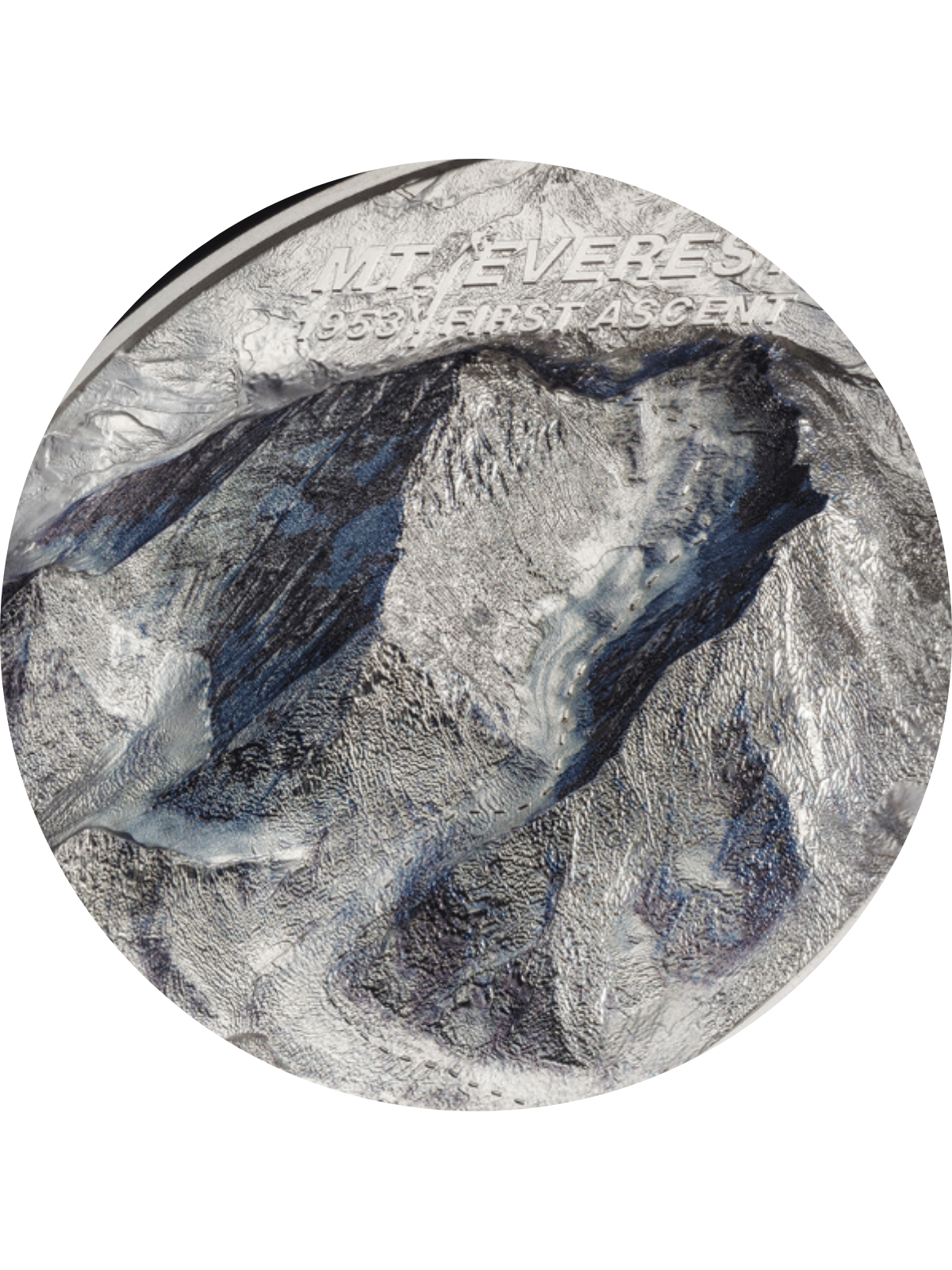 The thrill of conquering the world's highest peak comes to life in the impressive 1 kg silver coin, commemorating the first ascent of Mount Everest