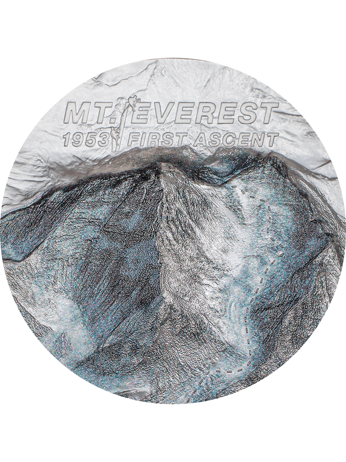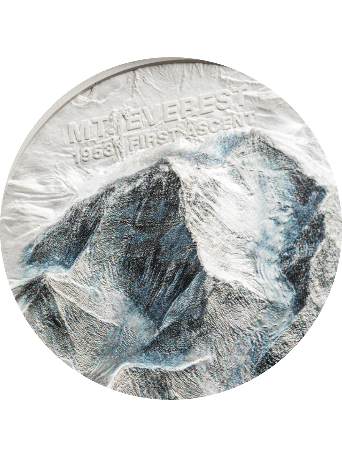 MOUNT EVEREST 2 Oz Silver coin dedicated to the first ascend on the world’s highest mountain, achieved for the first time in 1953: the Mount Everest. The coin features the Smartminting technology, has a stunning Ultra High relief, has an incredible design, has Proof quality and comes in a case, along with the Certificate of Authenticity. Limited mintage of 1953 pieces worldwide!