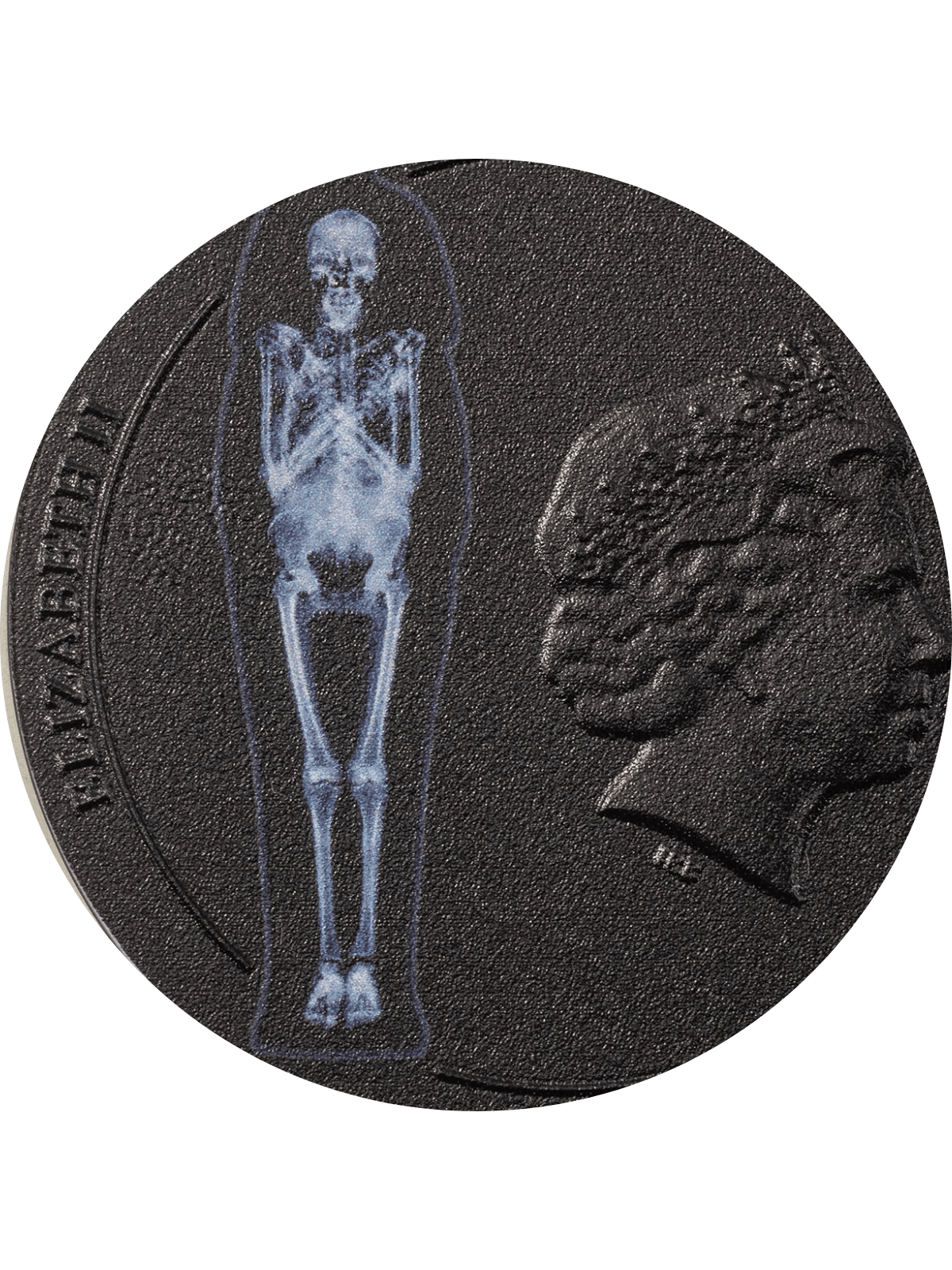 MUMMY X Ray 1 Oz Silver coin is the second issue in the “X-Rays” series, embodying the fascinating idea of mixing an ancient topic with the modern invention of the x-rays. In this issue, the Mummy. The coin features Smartminting technology, has Proof quality with selective coloration and comes in a case, along with the Certificate of Authenticity. Limited mintage of 999 pieces worldwide!