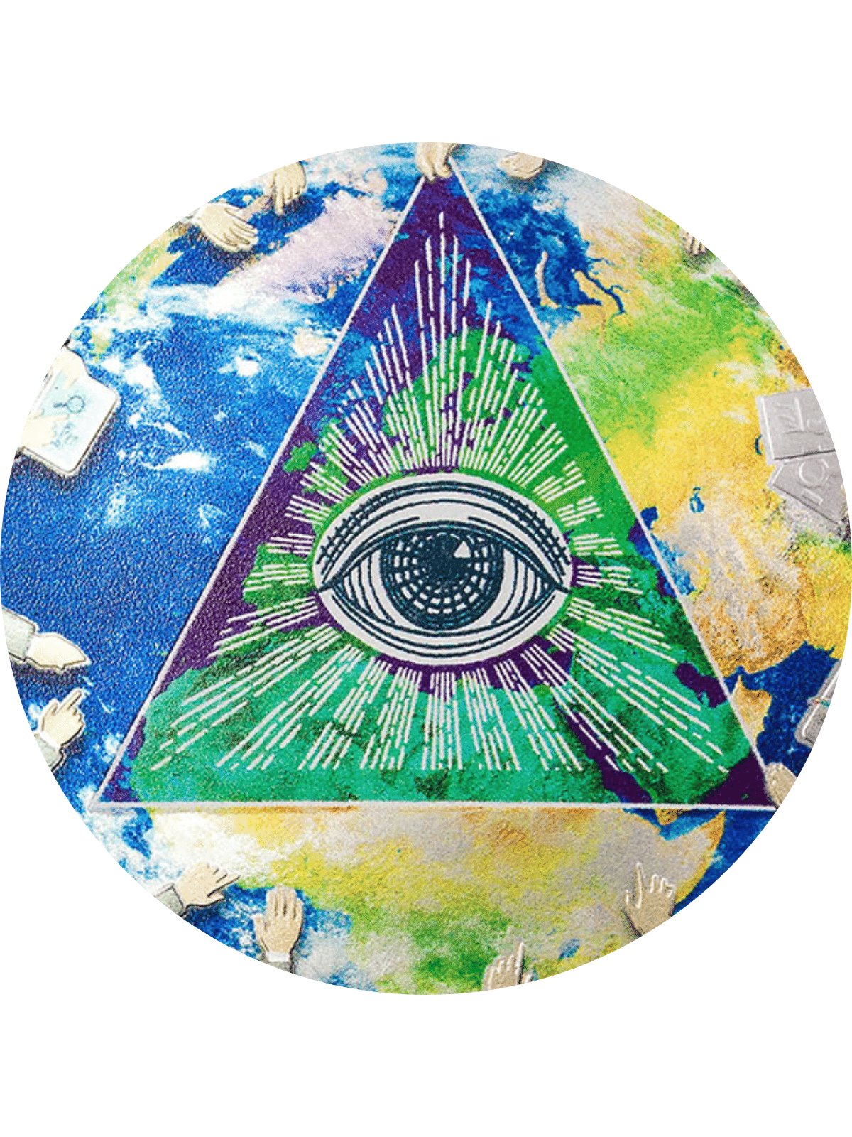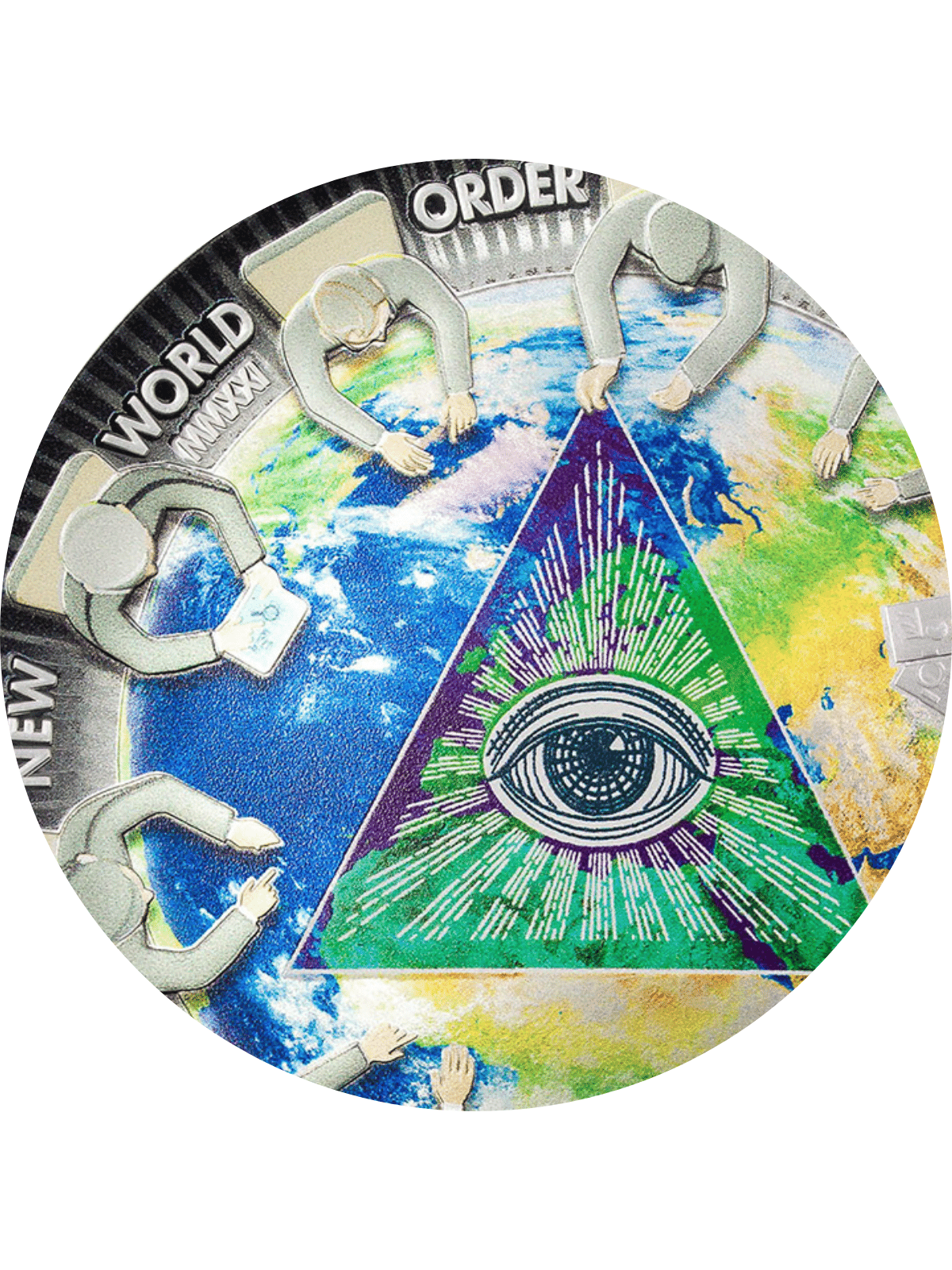 NEW WORLD ORDER 2 Oz Silver coin is the third release in the “Great Conspiracies” series, dedicated to the world’s most famous conspiracies. In this edition – New World Order. The coin features a concave shape, thanks to the Smartminting technology, has Proof quality, is partially coloured and comes in a case, along with the Certificate of Authenticity. Limited mintage of only 500 pieces worldwide!