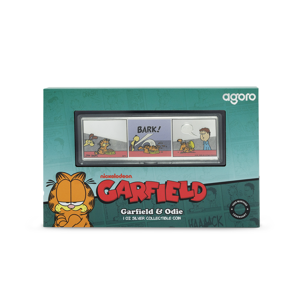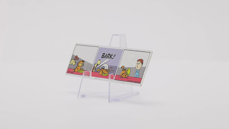 Every detail—from Garfield’s stolen snack to Jon’s unforgettable deadpan punchline, “Pets.”—is preserved in full colour with original text and artwork. The reverse adds frosted Garfield imagery, engraved quotes, and mirror-finish accents, creating a premium silver tribute to one of the most beloved moments in Garfield history.