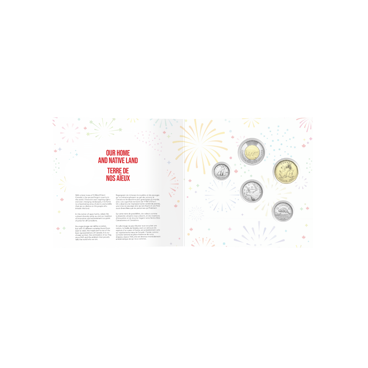 Turn a moment into a cherished memory with the O Canada gift card set! Whether you’re looking for a special souvenir, a little piece of Canada to gift, or just a fun way to express your love for this country, the O Canada gift card set is your perfect keepsake for 2025. Inside the easy-to-mail, greeting-card packaging are five 2025 uncirculated coins, and one of those coins is an exclusive $1 coin featuring two classic images of Canada: our nation’s flag and the mighty polar bear, the beloved symbol of Canada’s Arctic region and its resilient spirit.