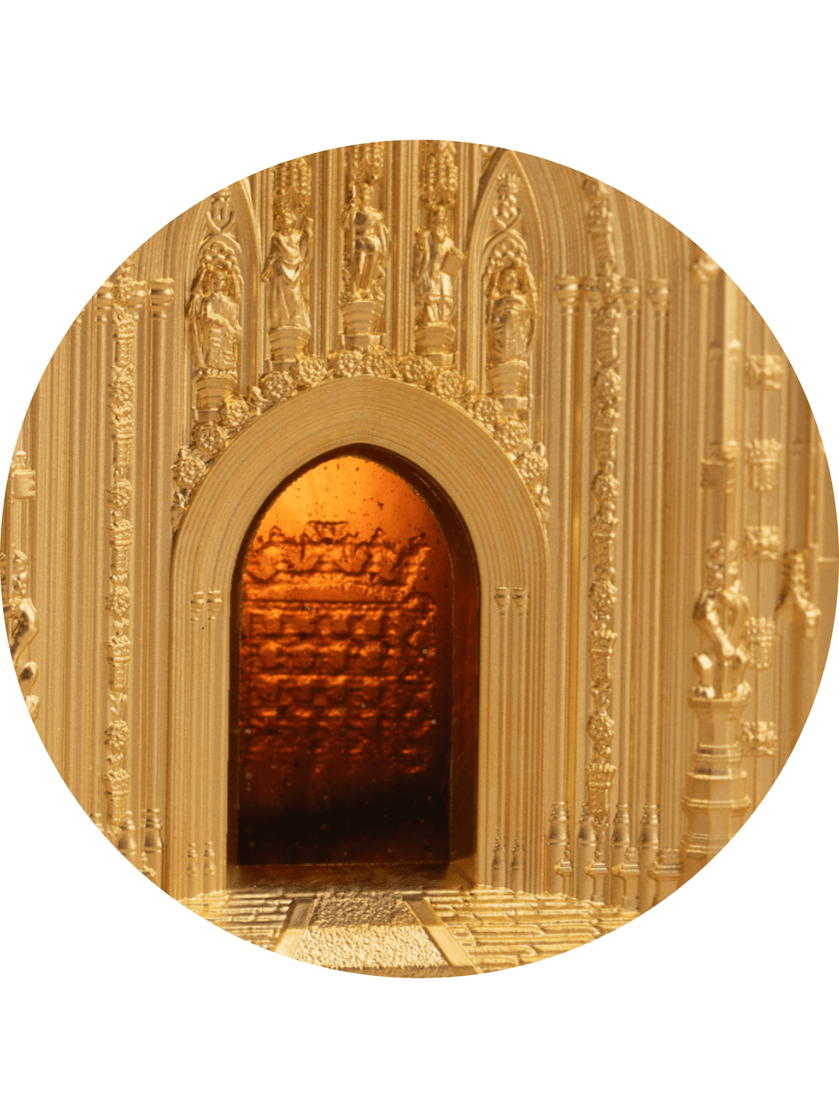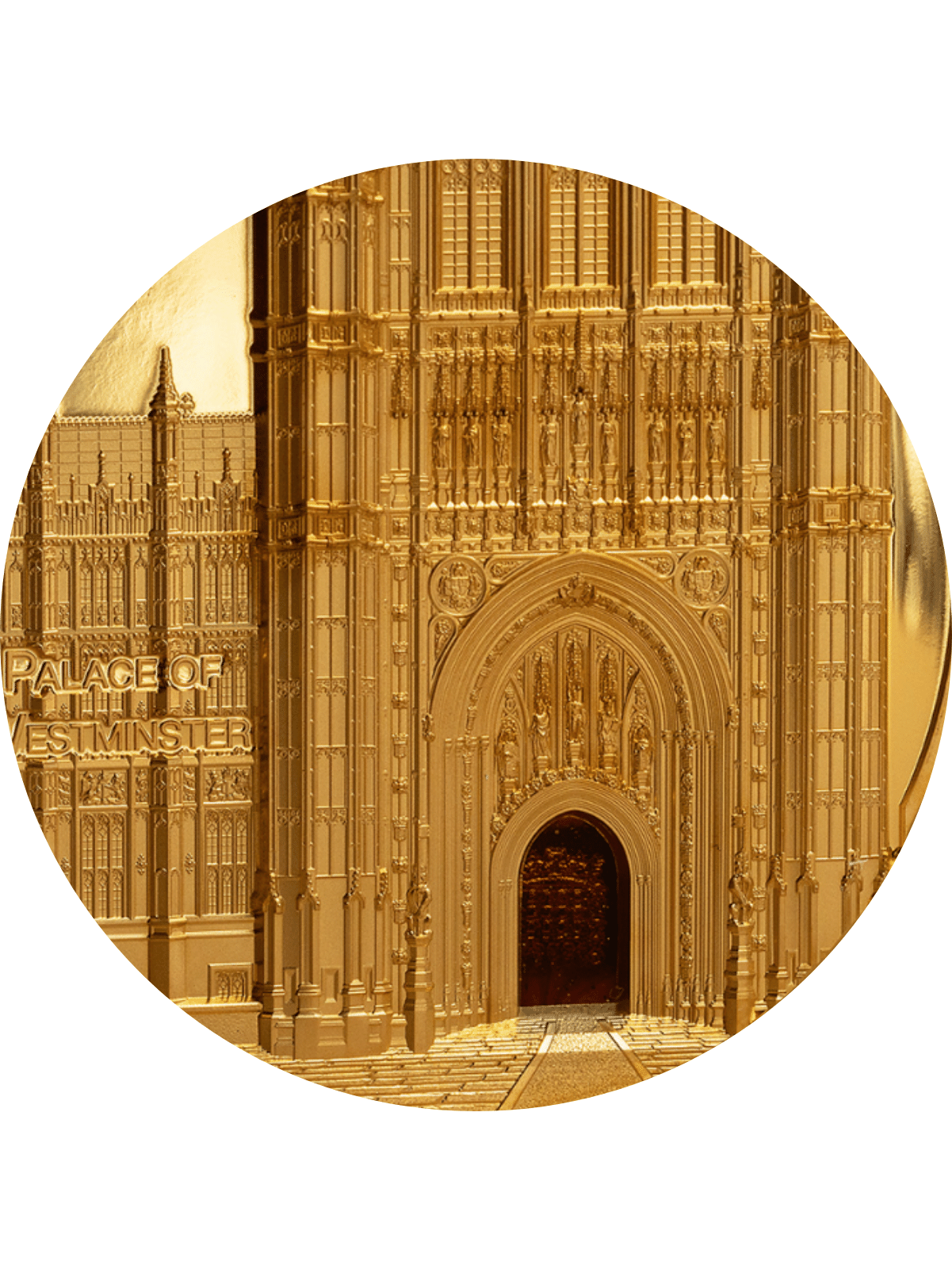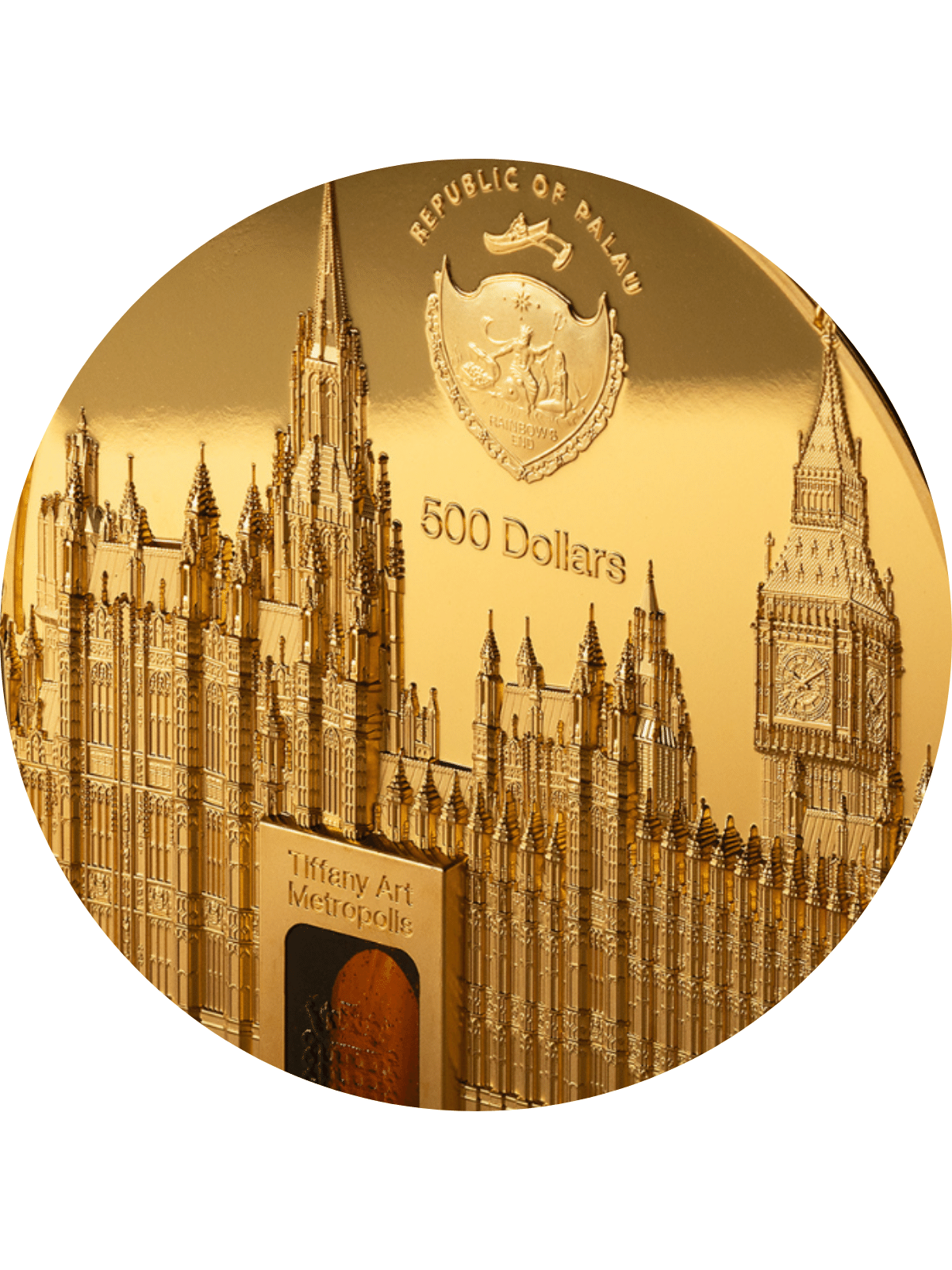 PALACE OF WESTMINSTER 5 Oz Gold coin is part of the well-known "Tiffany Art" series and is dedicated to the theme of Metropolis. In this issue: the Palace of Westminster, the official residence of the UK Parliament, located on the bank of the River Thames in London, showing the striking Victorian Gothic architecture and the iconic Big Ben clock tower. The coin in Proof quality features the Ultra High Relief in Smartminting technology, has an amazing design, has a wonderful glass insert and comes in an elegant case, along with the Certificate of Authenticity. Limited mintage to 50 pieces worldwide!