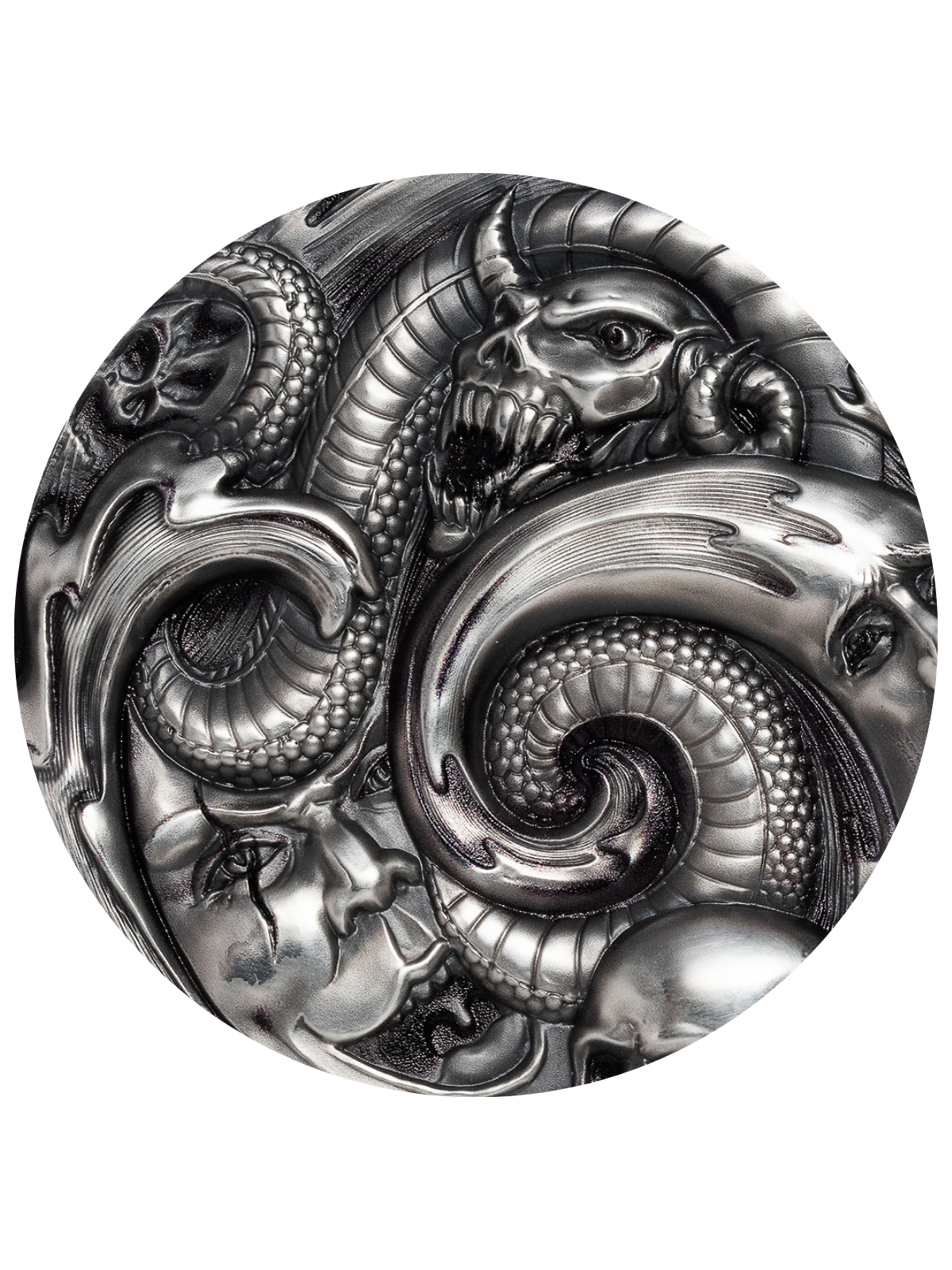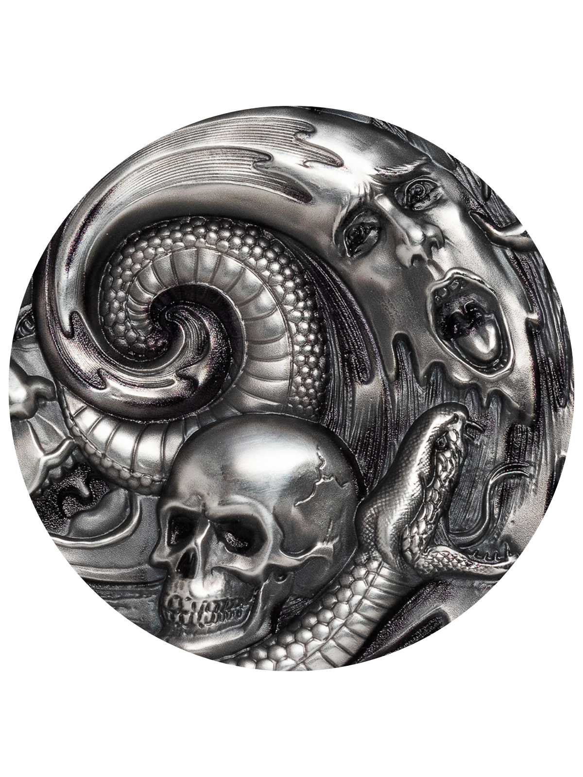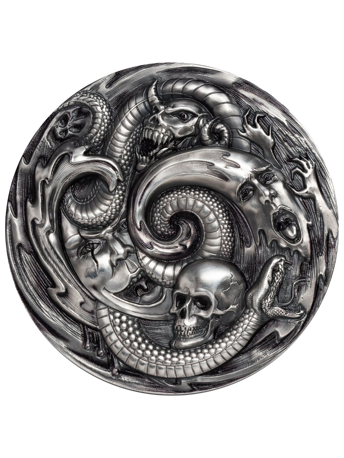 The reverse of the coin unveils a mesmerizing image that encapsulates the essence of Pandora's Box. An intricate depiction of curses, demons, and mythological creatures swirl in a chaotic vortex, seemingly escaping from their mystical prison. The EHR technology employed in the coin's design ensures an unprecedented level of detail and relief, bringing each element of the nightmarish scene to life. A snake, symbolizing deception and temptation, traverses from the reverse to the obverse, adding an extra layer of symbolism to the coin's narrative.