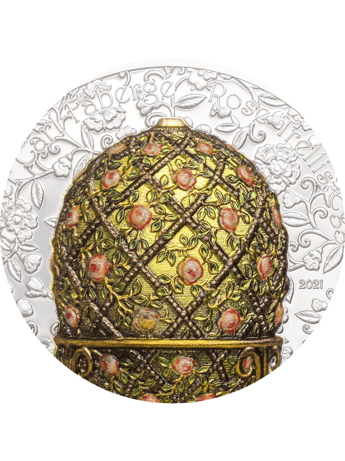 Indulge in the opulence and elegance of the Fabergé Egg Rose Trellis 2 oz Silver Coin, a remarkable tribute to one of the most renowned works of art in history
