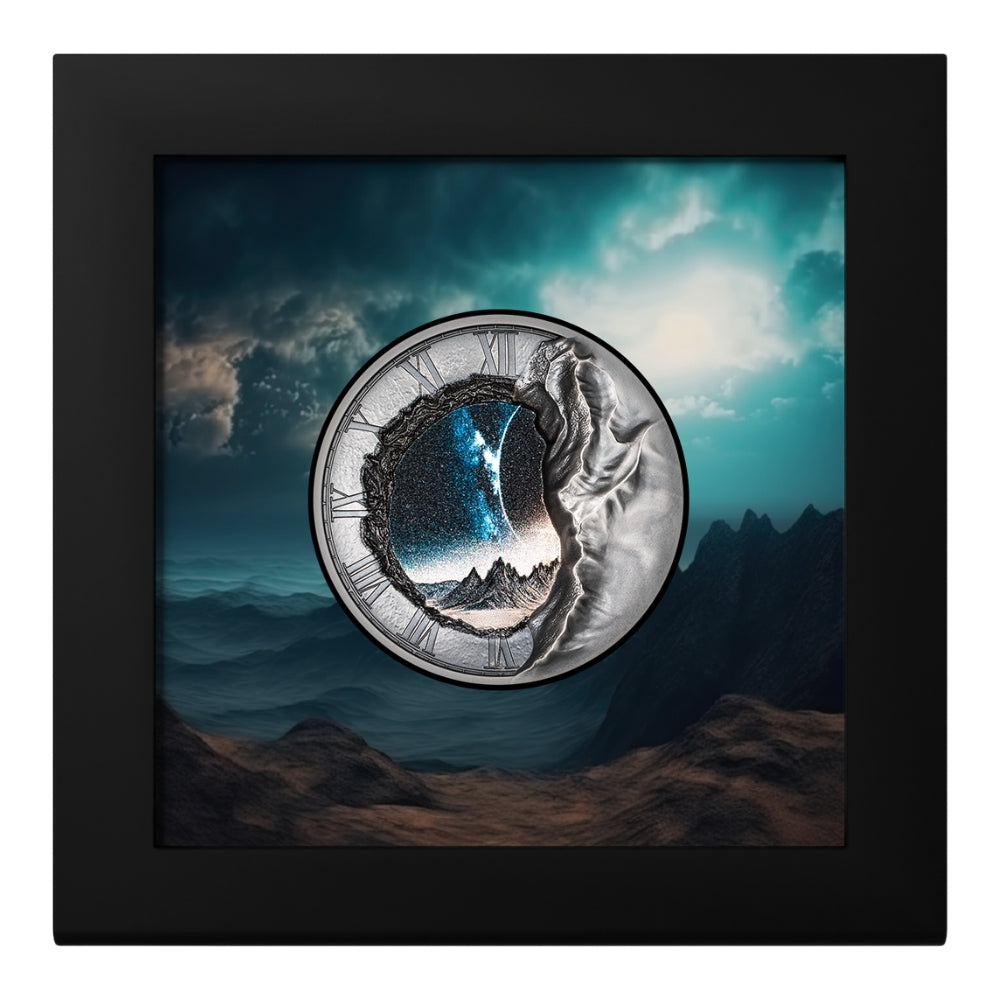 The 2025 Portal of Time 2 oz Silver Coin brings this fascination to life in a futuristic way. The design depicts a mysterious time portal uncovered in the desert, its ancient structure revealed with breathtaking detail. Through smartminting® technology and special coloring effects, the coin captures the aura of timelessness, making the portal appear both ancient and futuristic at once.