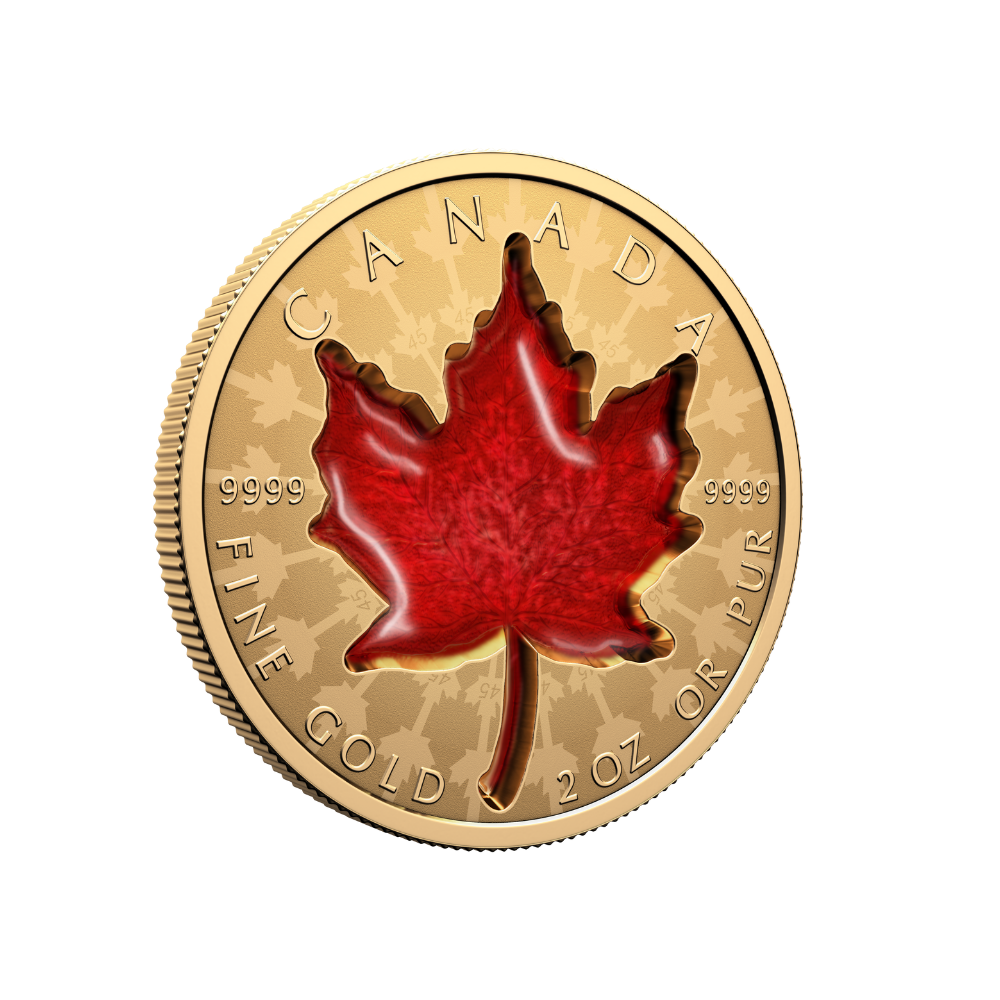Translucent red enamel gives this Gold Maple Leaf a bold, modern twist on an iconic design. The 2024 edition radiates with warmth and elegance, featuring a vibrant red sheen that illuminates the deeply incused maple leaf at its center. Crafted from 2 oz of 99.99% pure gold, this special issue blends artistry and craftsmanship with a “maple burst” field pattern that seems to radiate outward from the leaf — a dynamic design symbolizing energy, pride, and Canada’s enduring spirit.