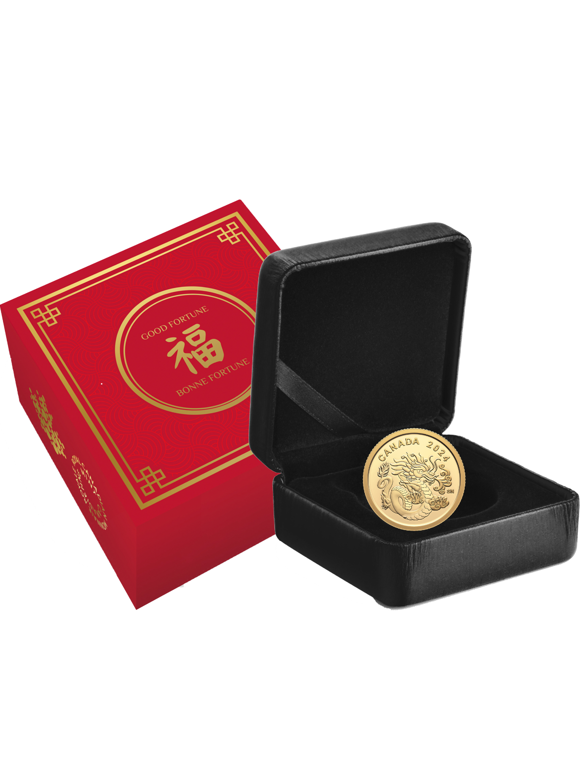 As the fourth Chinese spirit dragon in a beloved series, this coin continues the Royal Canadian Mint's tradition of featuring art motifs and symbols cherished in Chinese-Canadian culture. The 1/20 oz. gold blank makes this limited-edition coin one of the most accessible pure gold offerings in 2024, providing collectors with a rare opportunity to own a piece of this highly sought-after series. Limited to just 8,888 coins worldwide, this collectible comes with a serialized certificate from the Royal Canadian Mint, ensuring its authenticity and adding to its desirability among collectors.