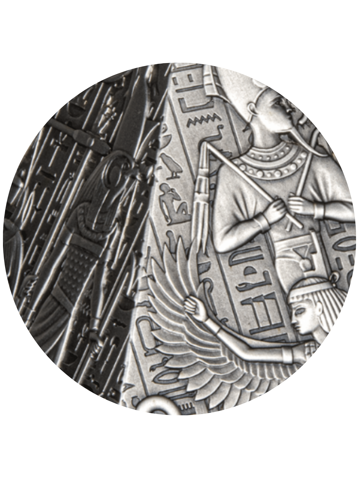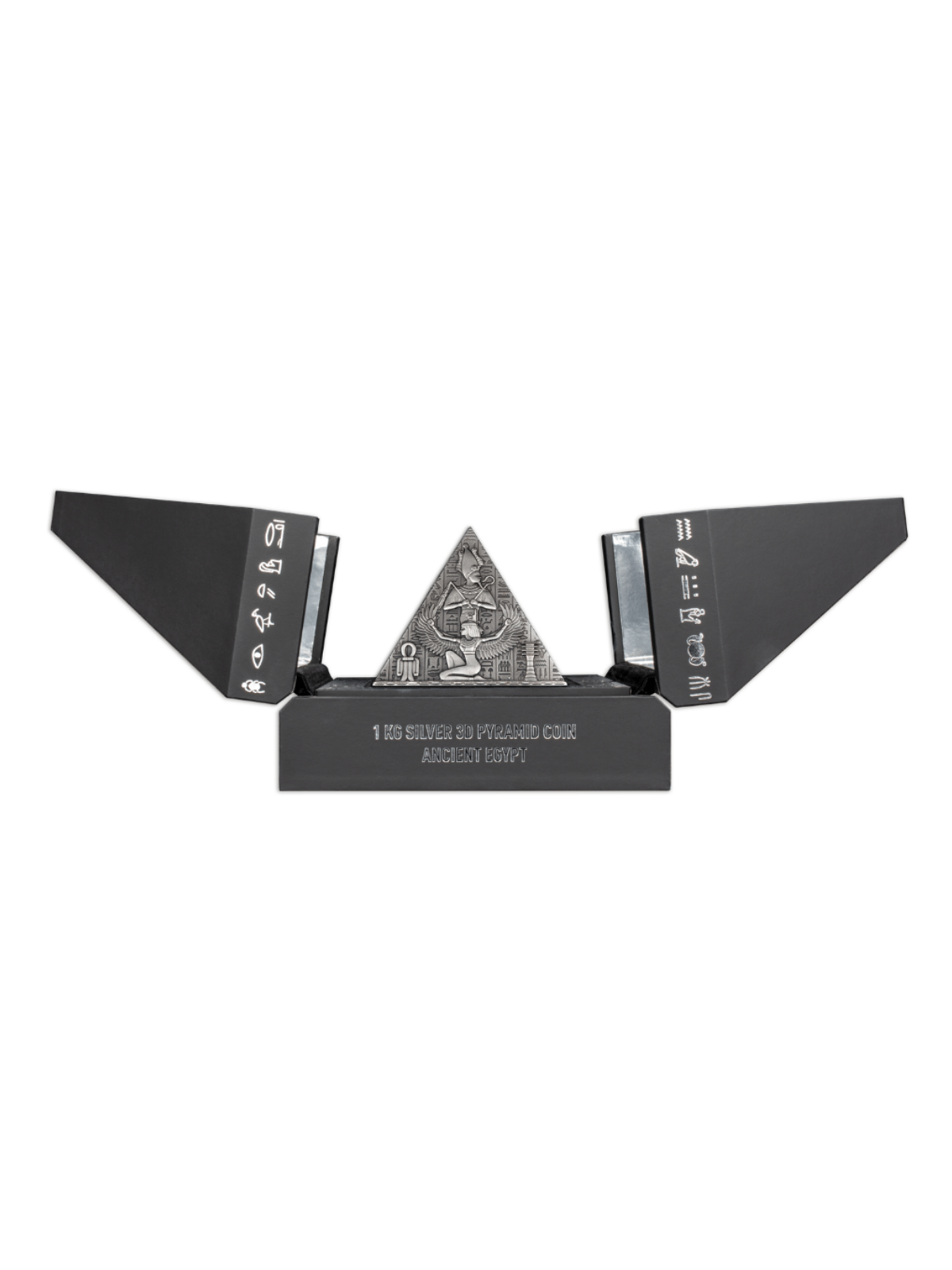 PYRAMID 3D 1 Kg Silver coin is a 3D work of art representing the Pyramid of Ancient Egypt, considered as a sacred stairway to afterlife. The coin has an extraordinary 3D shape, in Antique Finish quality, with an appearance of a decorative tomb engraving. It comes in a luxury themed case, along with the Certificate of Authenticity. Limited mintage of 199 pieces worldwide!