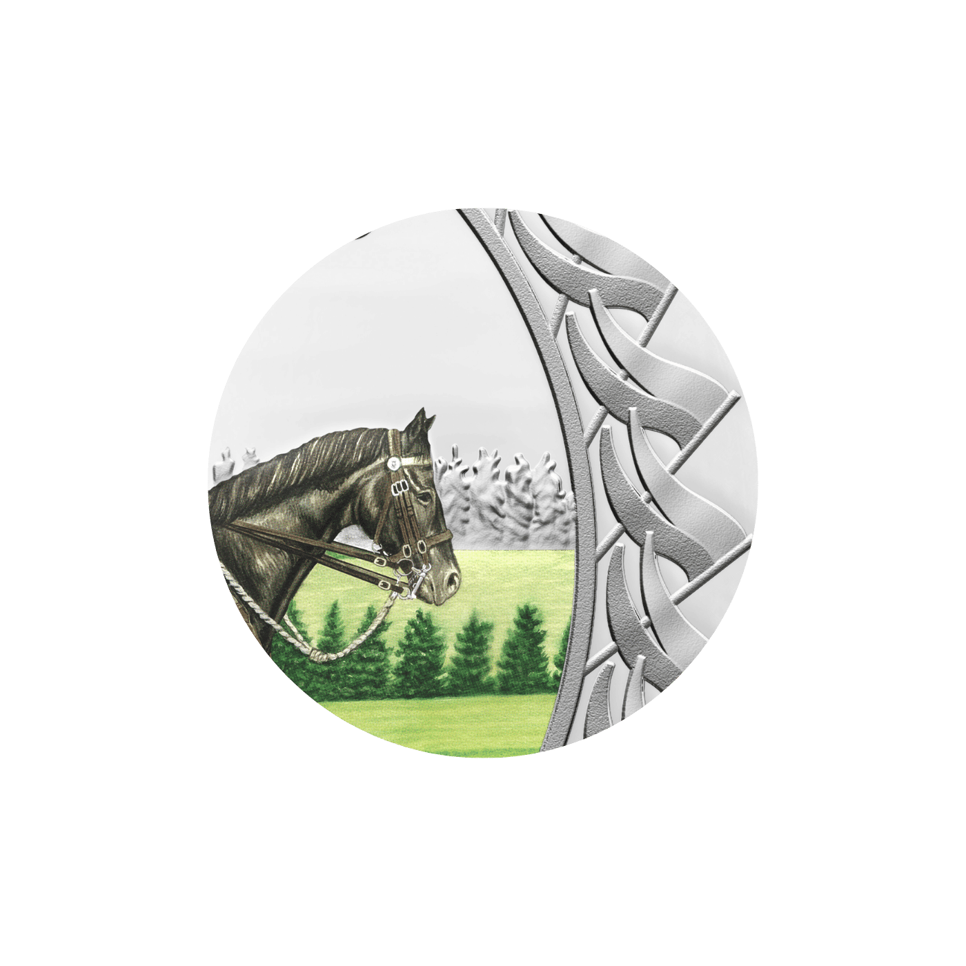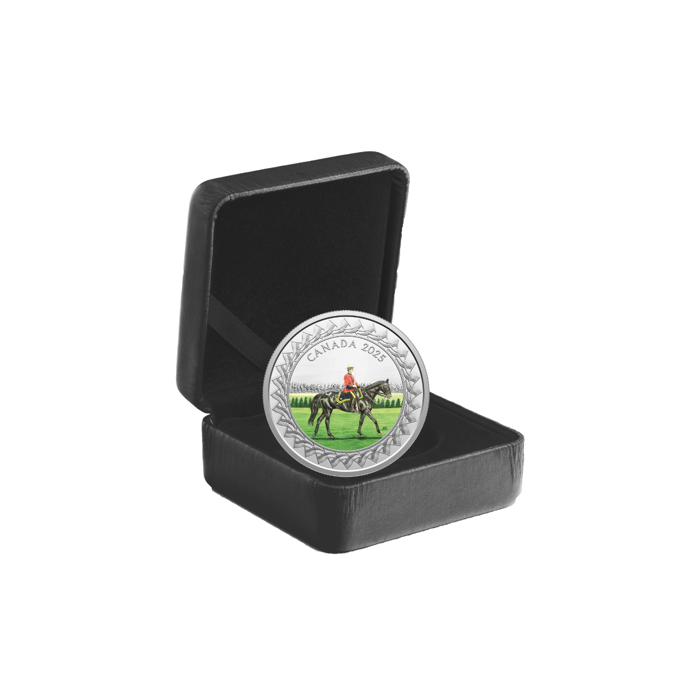 This selectively coloured silver coin captures the spectacle of up to 32 mounted RCMP officers performing choreographed drills and cavalry formations set to music—an event recognized both at home and around the world.