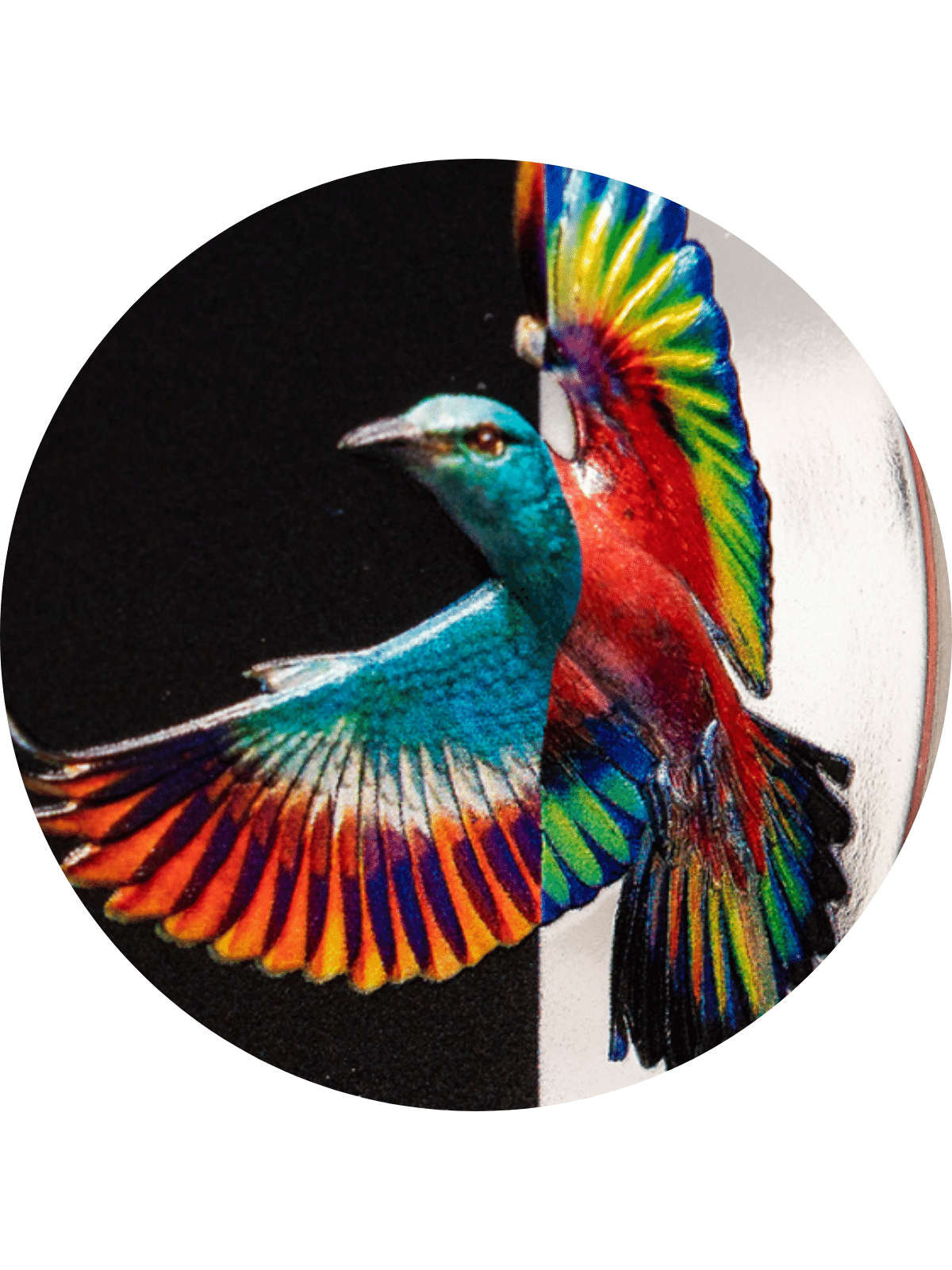 ROLLER 1 Oz Silver coin features the beautiful bird, also known as the eye-catching European Roller. The coin was created mixing different styles, has a Proof quality and an Ultra High Relief thanks to the Smartminting technology. It comes in a case, along with a Certificate of Authenticity. Limited mintage of 1500 pieces worldwide!