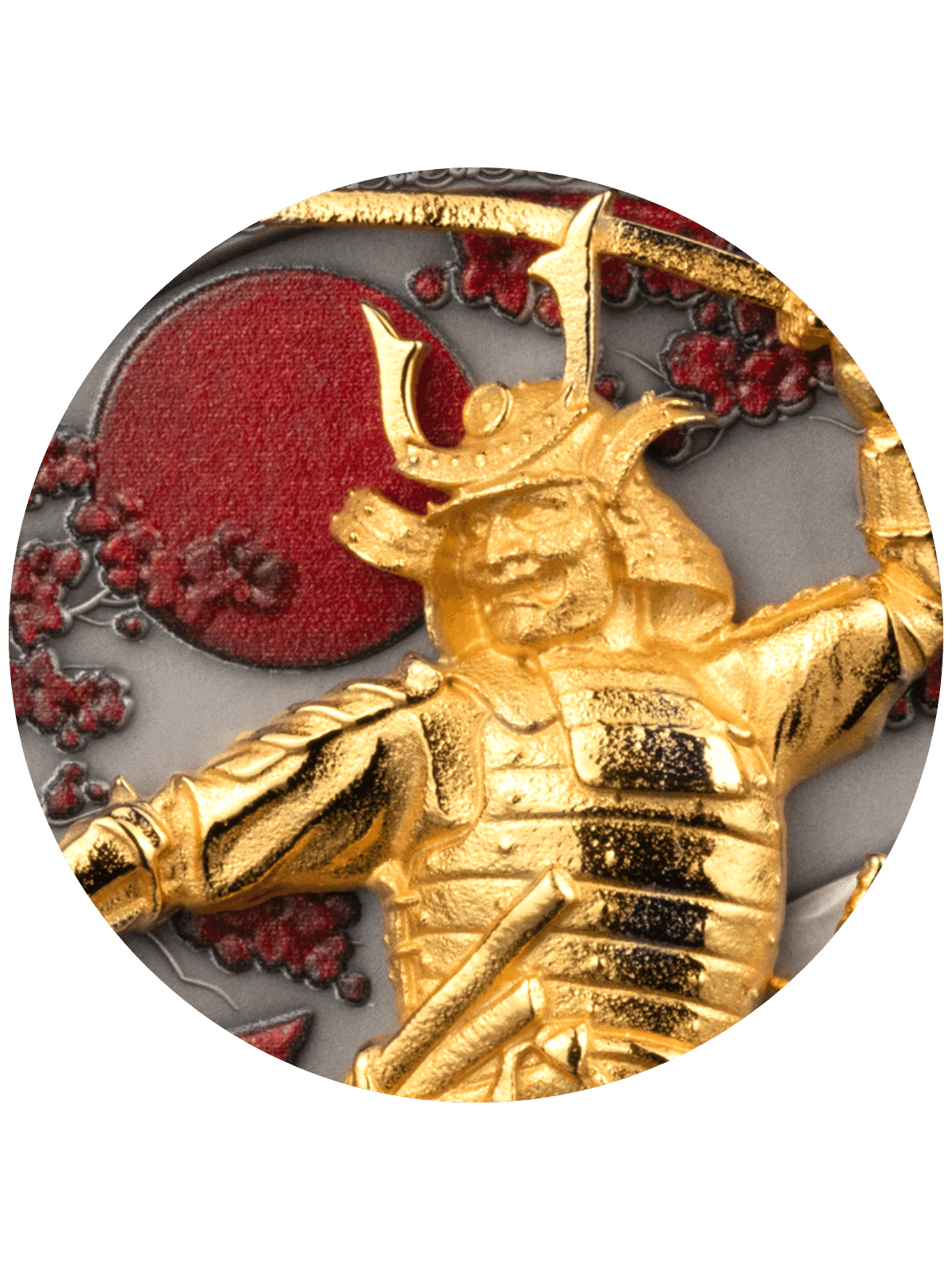 A glimpse into the past: this beautiful coin with 24k Gold plating and partial colour print is an homage to the golden age of Japan‘s elite warriors in the 12th century.